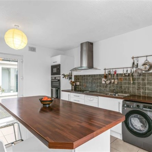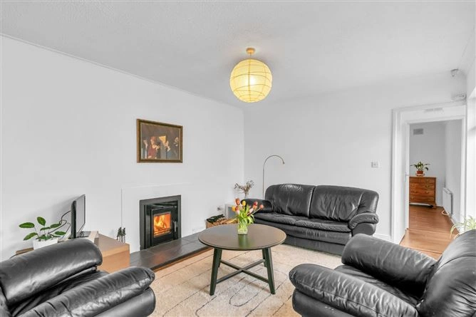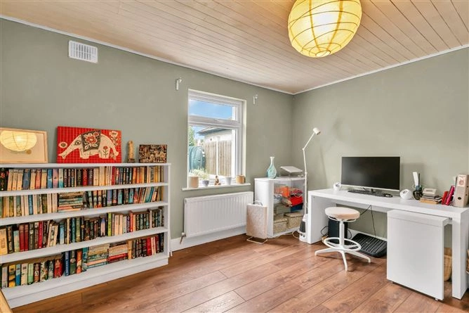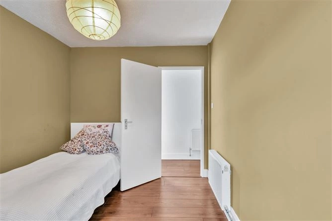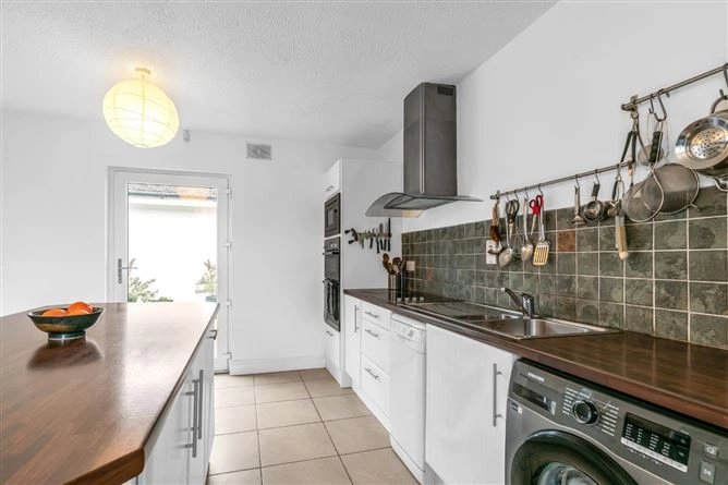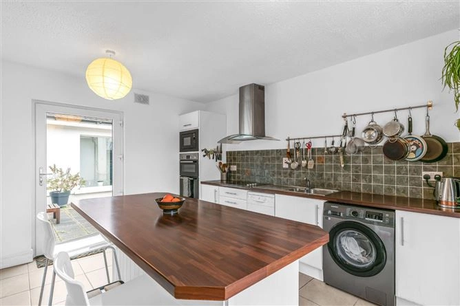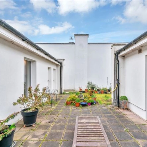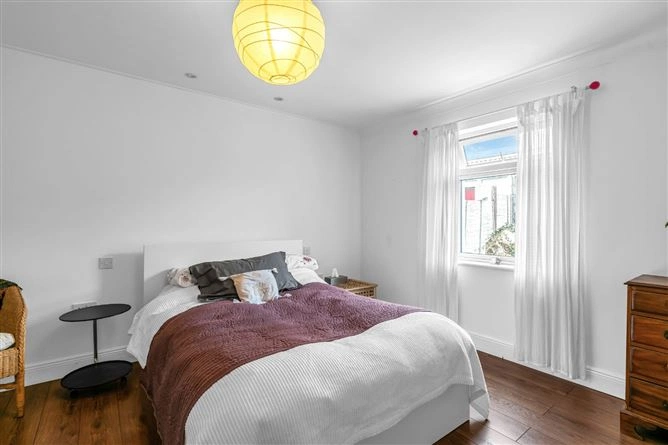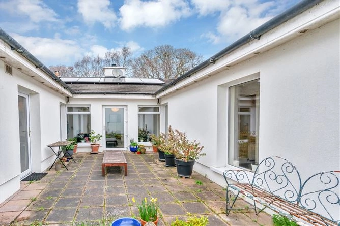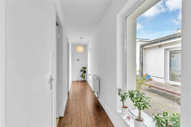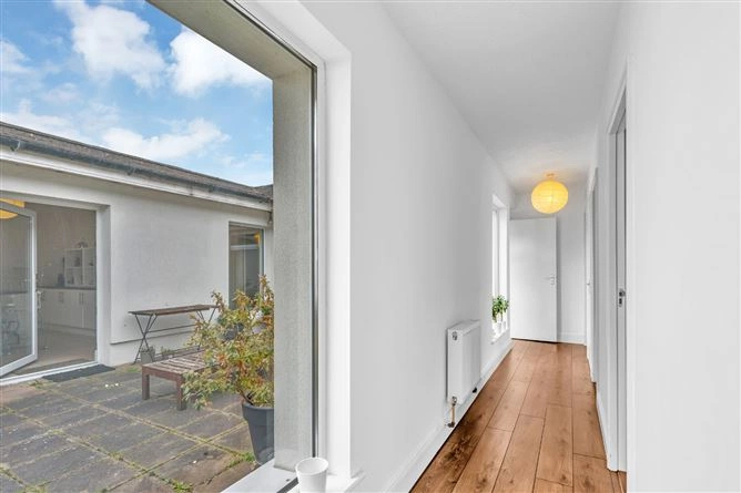The inner hallway leads to the bedrooms and features two large windows overlooking the courtyard. All three bedrooms are double rooms and have wood flooring – the first also boasts inset lighting, a large array of built-in wardrobes and coving. A large fully-tiled bathroom completes the accommodation. The property also has solar panels and boasts a B3 BER rating.