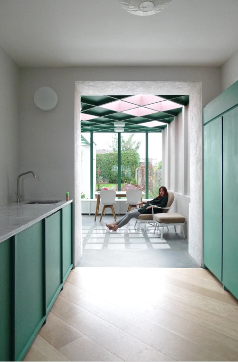 His innovative and colourful extension in London on an incredibly tight budget uses exposed and painted timber joists running at a 45-degree angle to create interest and movement. david-leech.co.uk