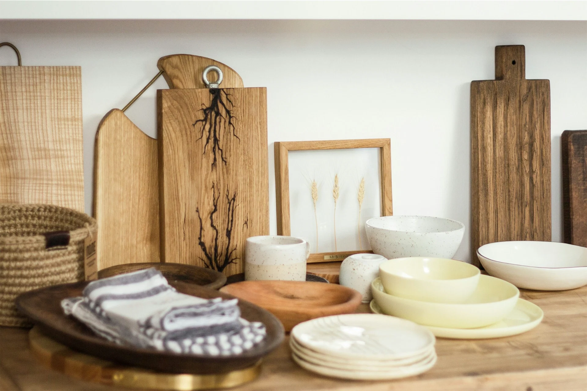 Use these tones to accessorise alongside your natural materials. Consider glass vases, wooden bowls, and natural wicker mats that incorporate earthy shades, adding a colourful lift to your biophilic backdrop.