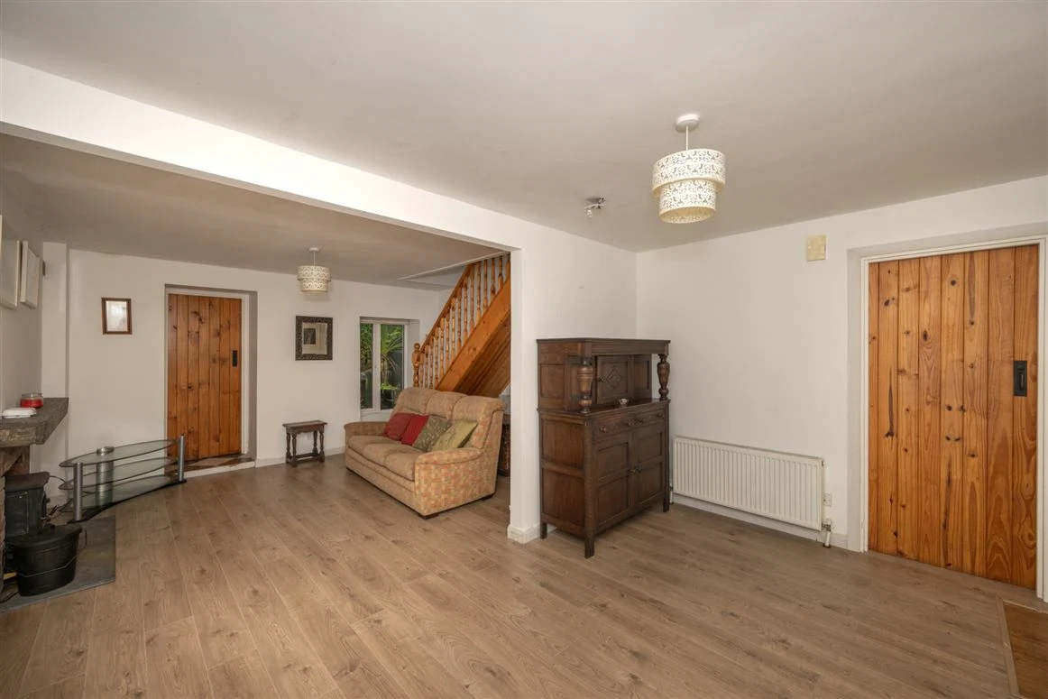 Open plan to the dining area, the same laminate wood flooring runs into the living area, which also features an attractive brick fireplace with a solid-fuel stove, slate hearth and wooden mantle.