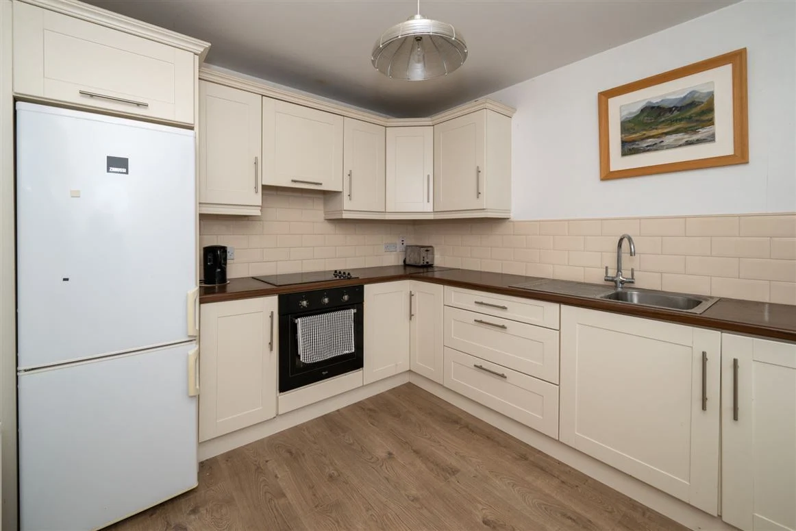 The kitchen is positioned to the front of the house and offers lovely water views. The space consists of laminate wood flooring, floor and eye-level units, tiled splashback and an integrated oven and hob. The dining area is open plan to the living area, giving a nice sense of space. There is laminate wood flooring and centre light.