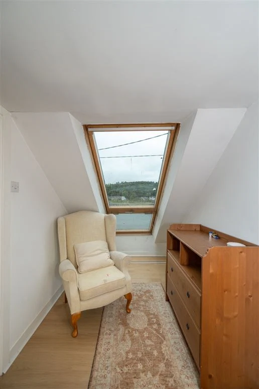 Off the landing, there is a Velux balcony that opens up to offer stunning panoramic views over the water across to Currabinny. Upstairs, both bedrooms are spacious with laminate wood flooring, two Velux windows each, and access to the eaves for additional storage.