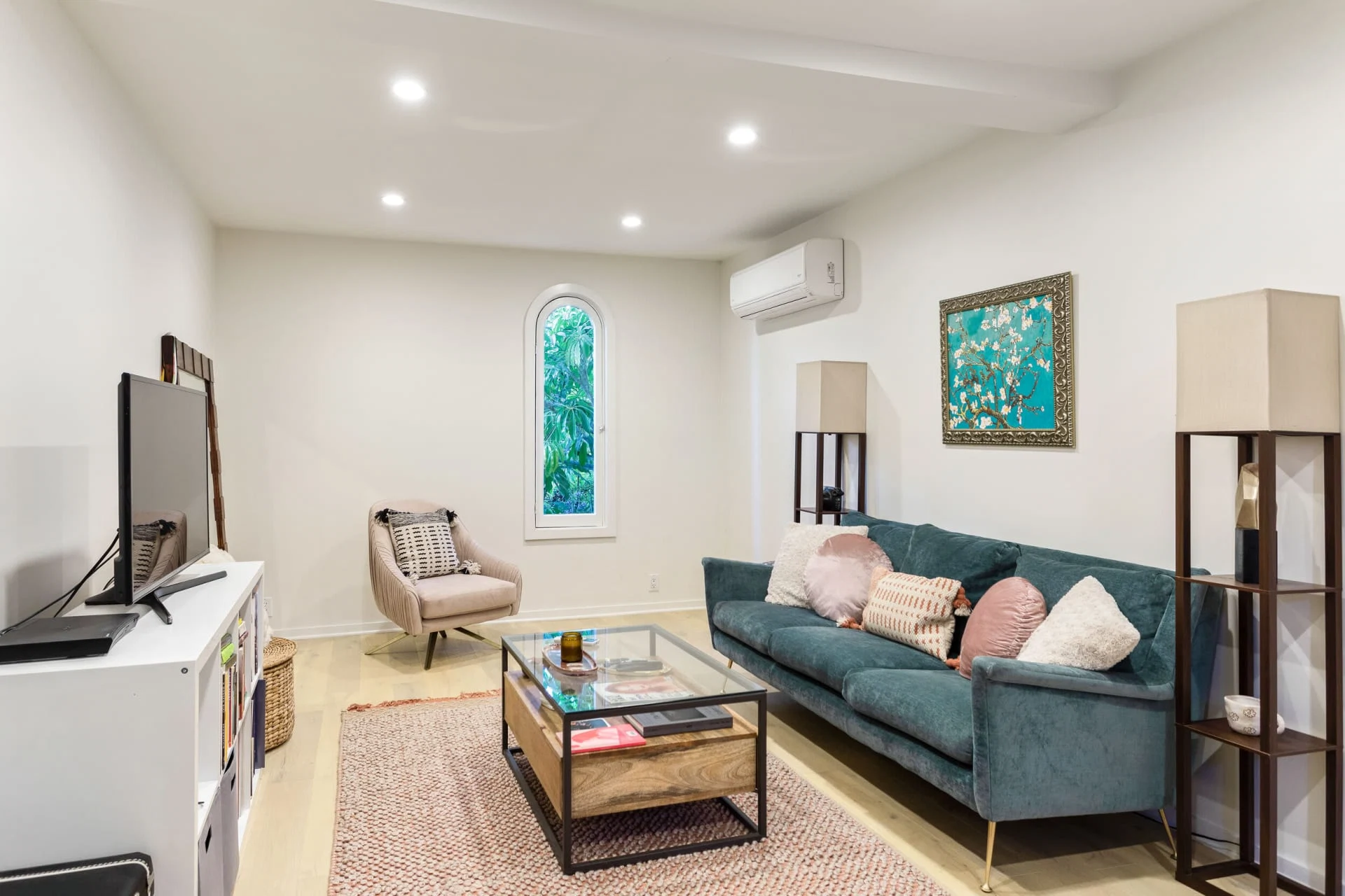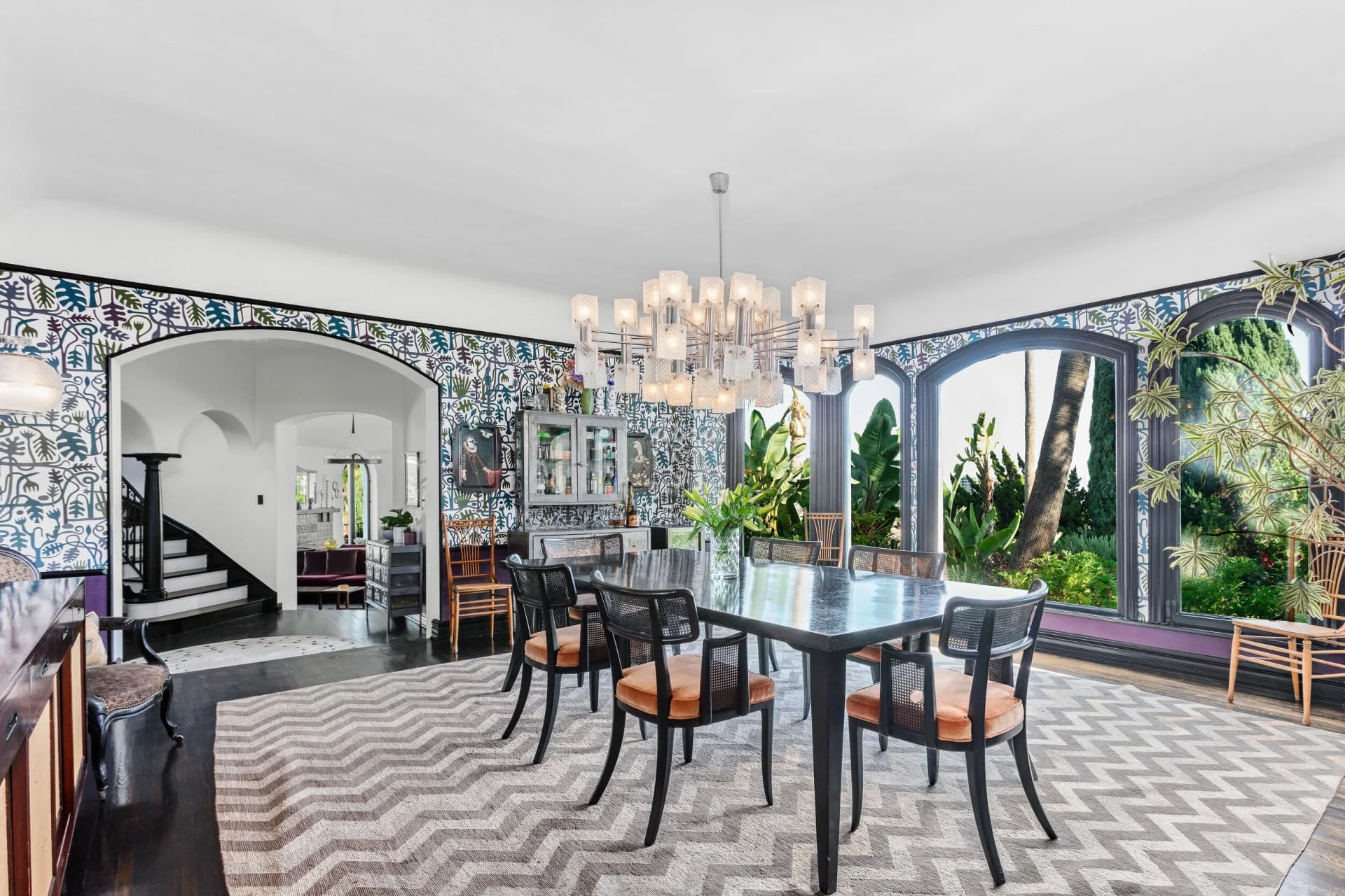 The historic architecture gives this place plenty of charm, complemented by modern additions, fun wallpaper in the dining room and master suite, and huge windows that capture the lush vegetation outside. The living room is double-fronted and swimming with daylight, with vaulted ceilings and an ornate tile fireplace.
