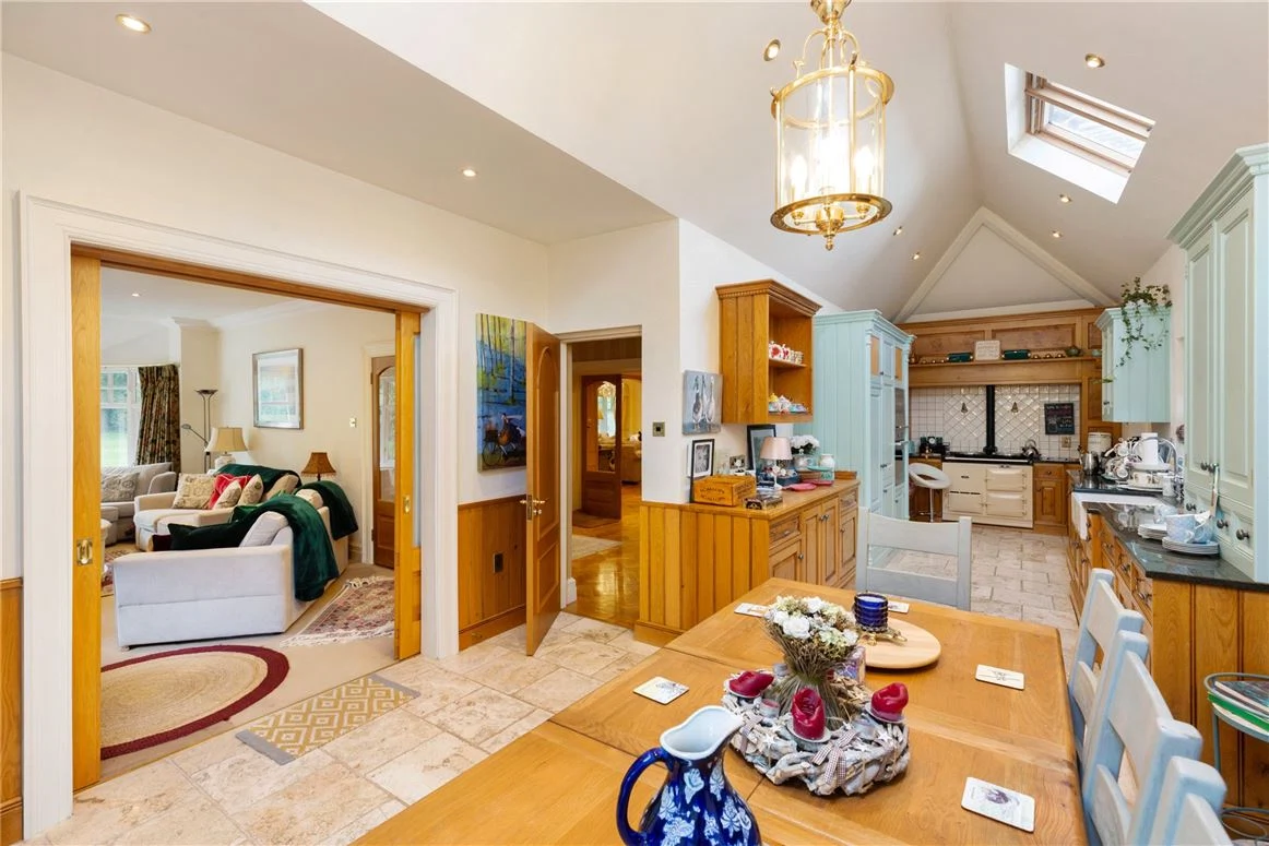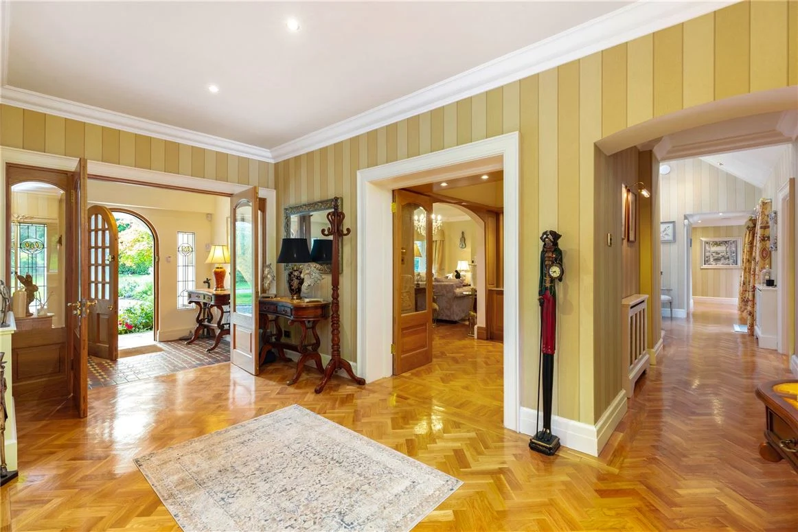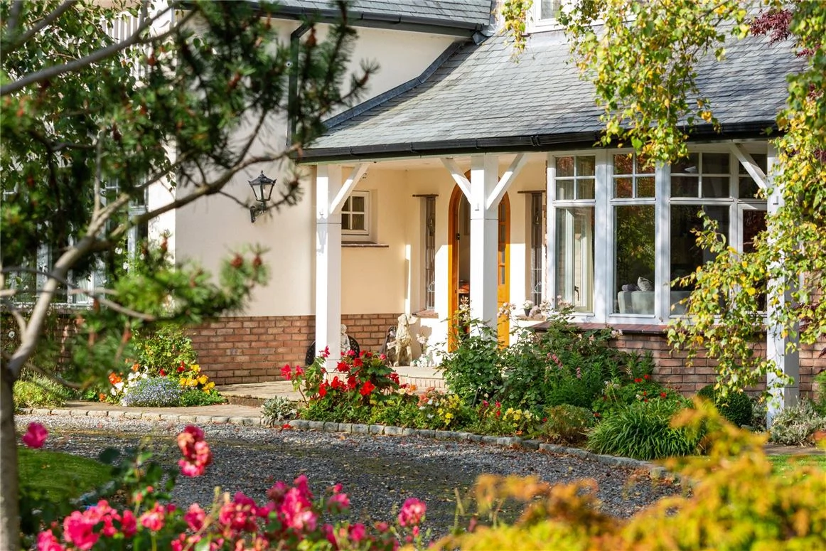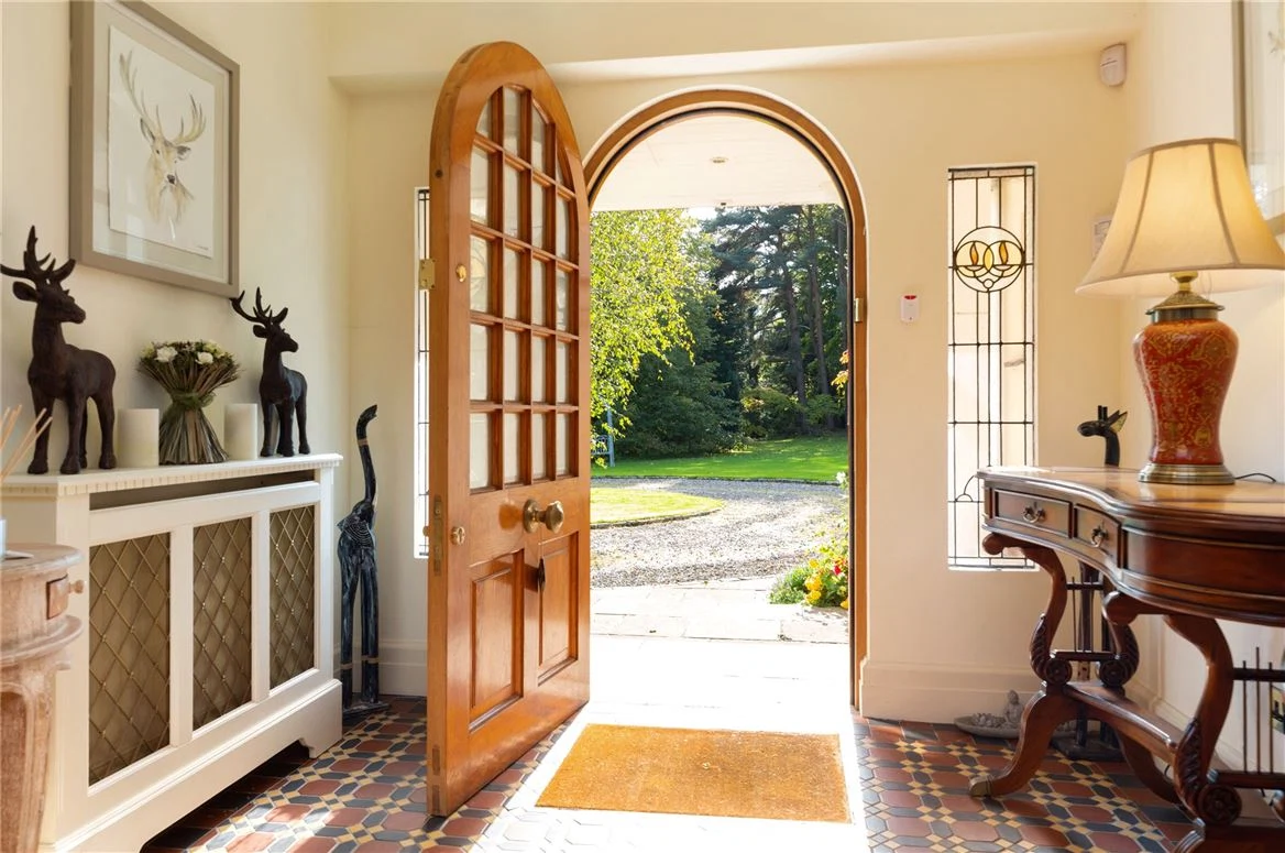 Arriving at the circular turn of the drive, the arched front door greets you from under a wide overhanging roof, offering plenty of shelter. Mosaic tiles in the porch lead into the main hallway. From here, you can head into the sitting room and kitchen/diner to the right or the drawing room to the left.