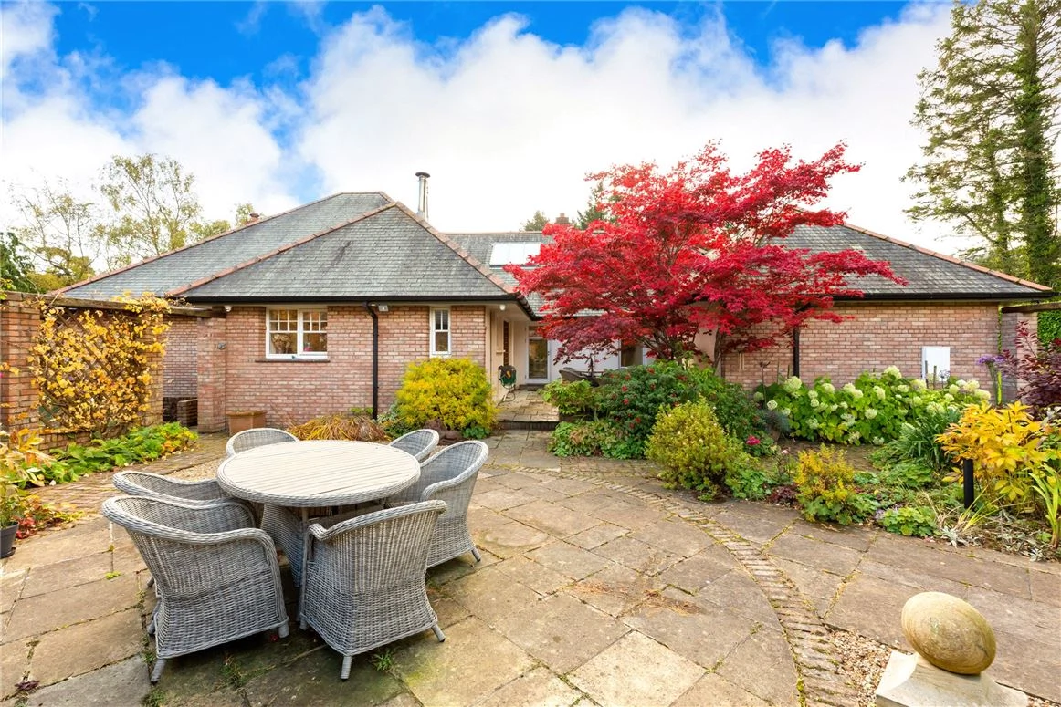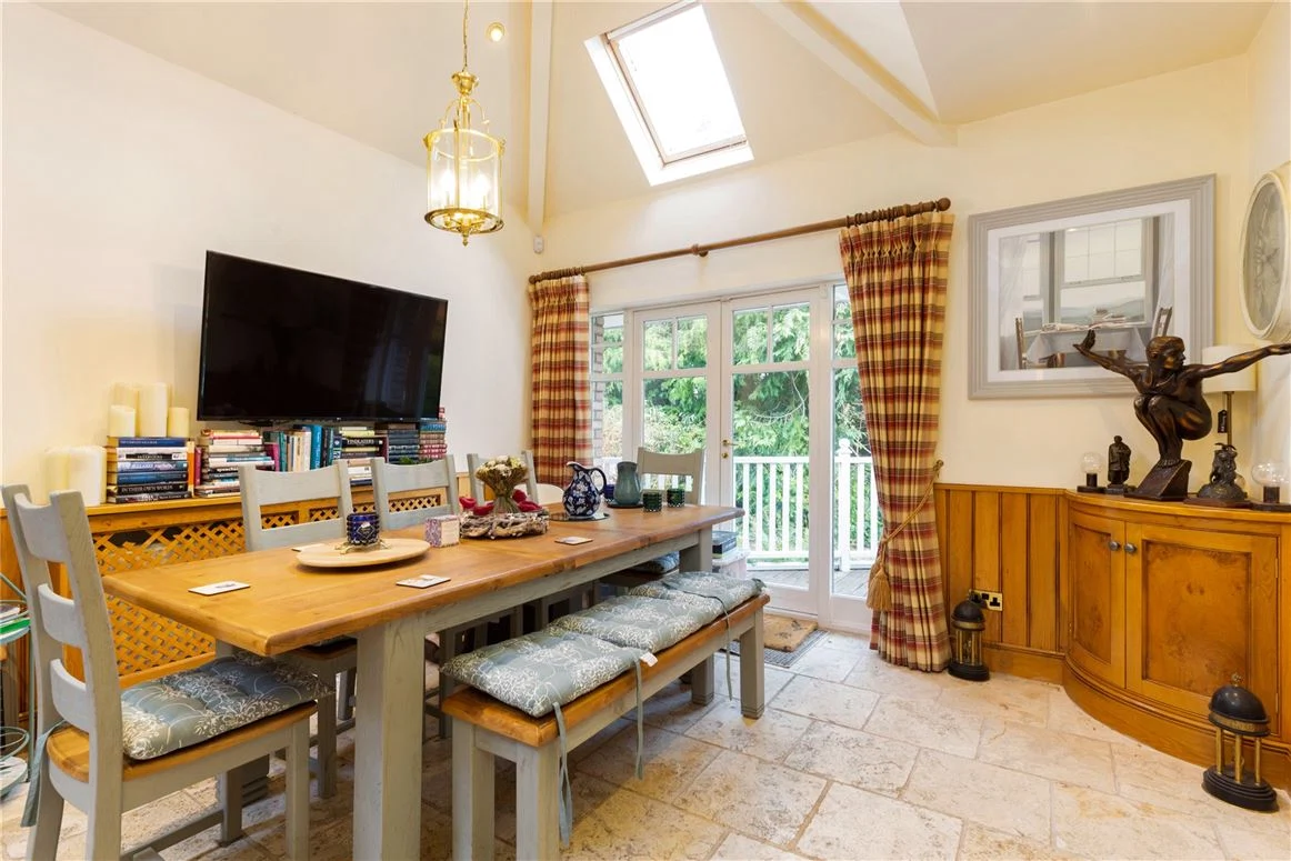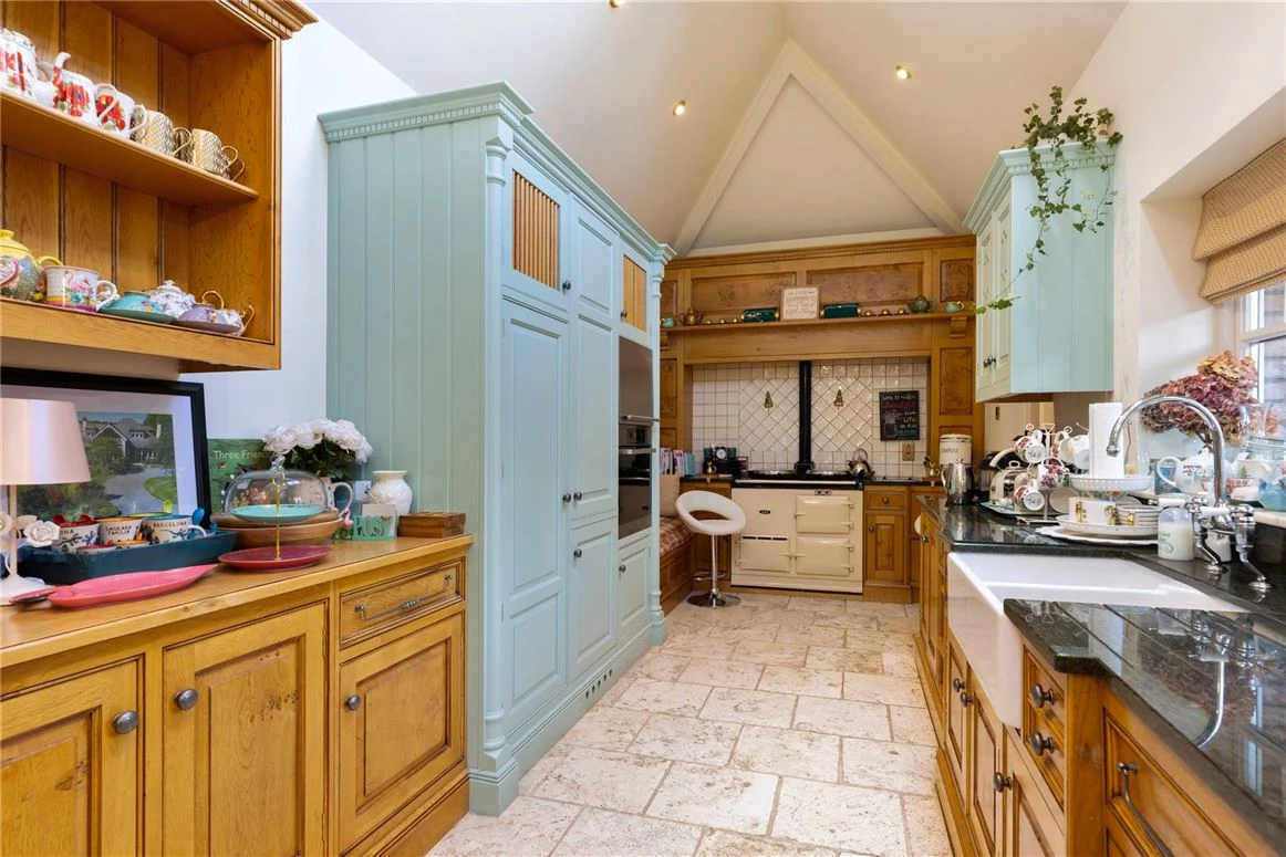 A smaller, more casual sitting room has a bay window and a simple sandstone fireplace of its own, as well as cushioned window seats. A sliding door leads to the kitchen/diner. The country-style kitchen is a combination of varnished wood and painted units in a duck egg blue. It also includes a cream oil-fired Aga and views onto the back yard. There’s a dining table located here too, with a set of French doors leading onto a decked patio.