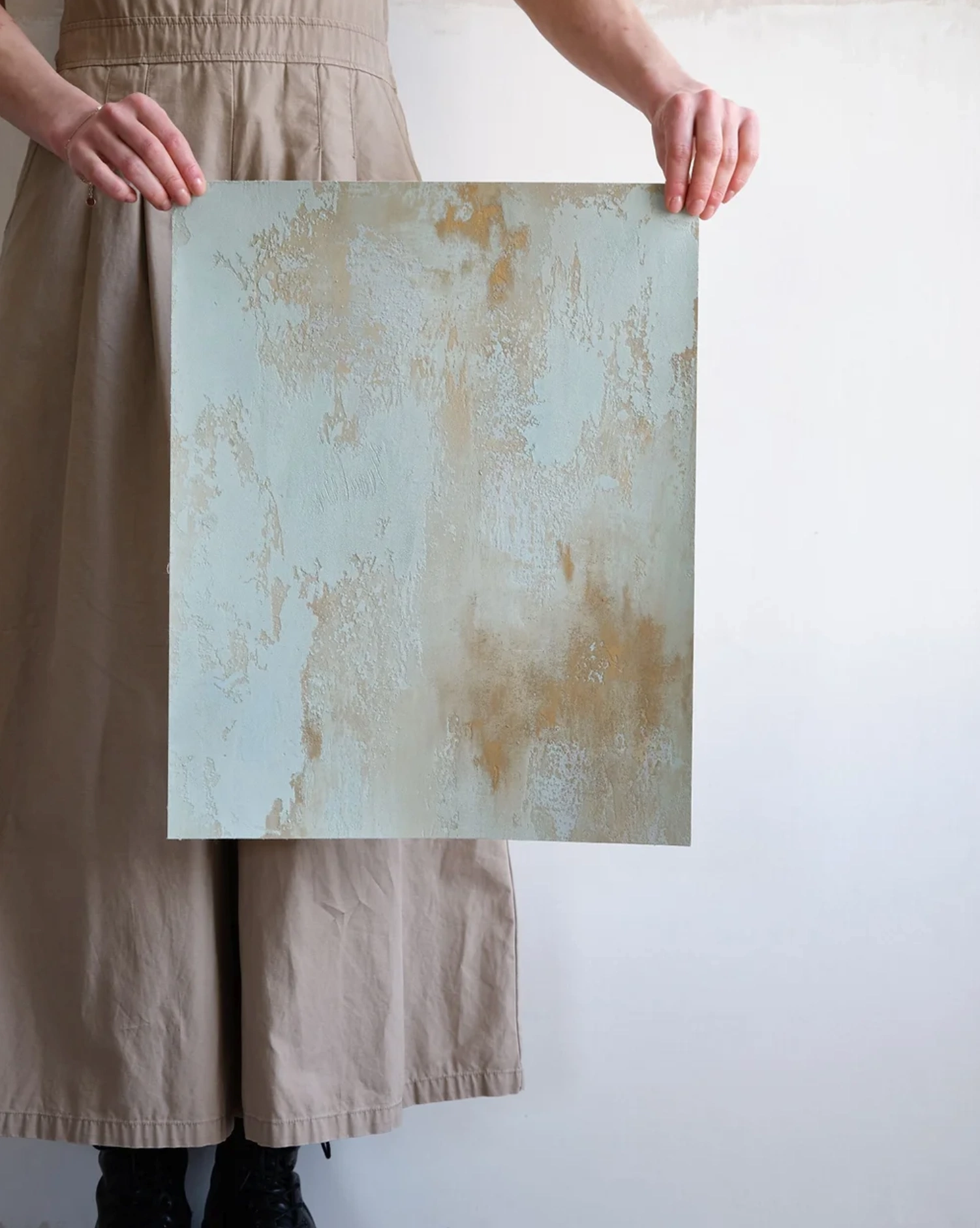 It is the same process of fusing and layering the finest-quality Italian plaster with a woven base. Then, I cut each piece by hand and work on them individually, adding layers of colour glaze and plaster. In the end, I get original art textures that can be used on their own or in combinations for a wall mural effect.