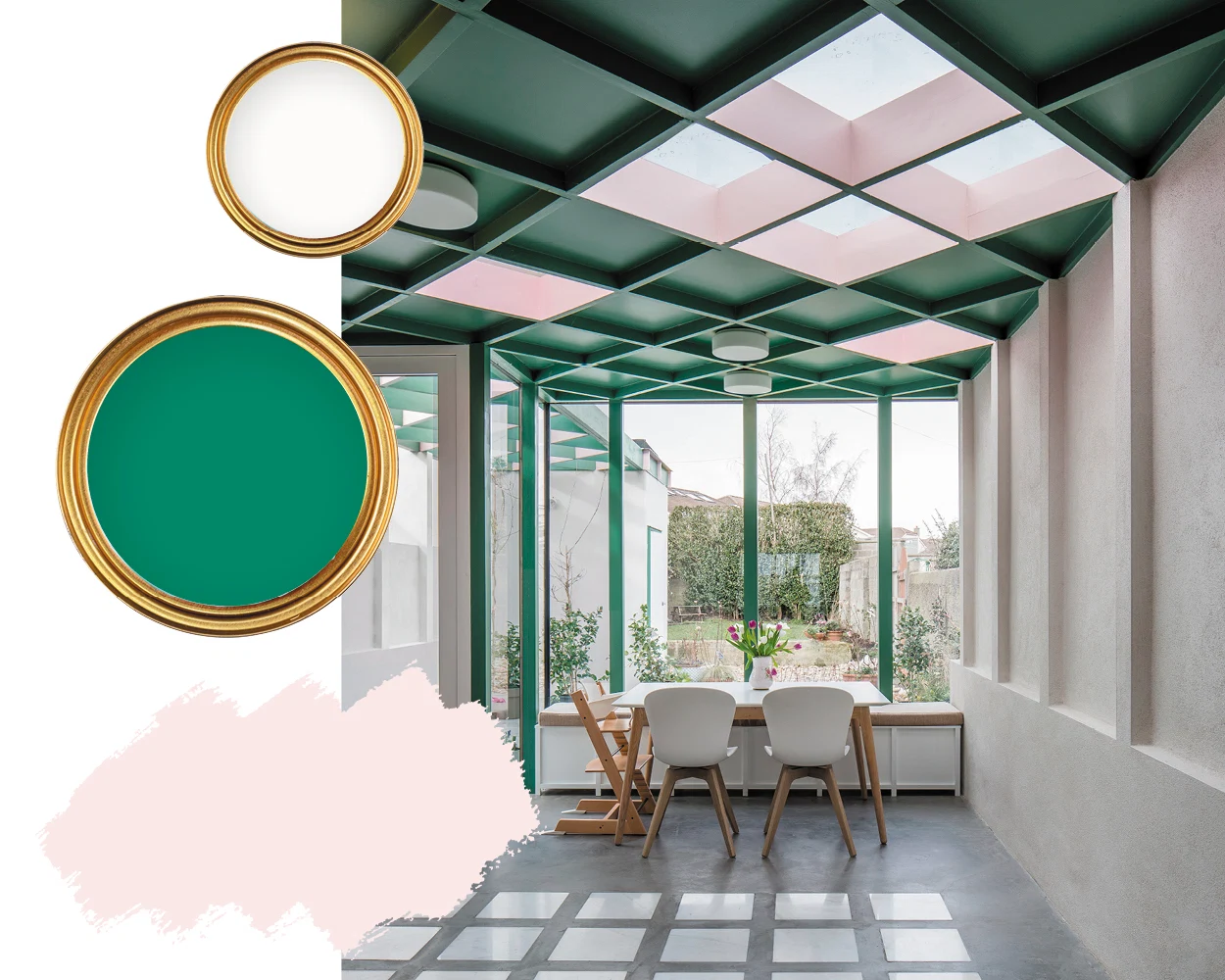 Rear garden room extension in a North Dublin home designed by David Leech Architects. Photographed by Joseph Carr. Loft White, from €21.50, Little Greene. Jade Cluster 3, Dulux. Day at the Races pink, from €25, Curator.