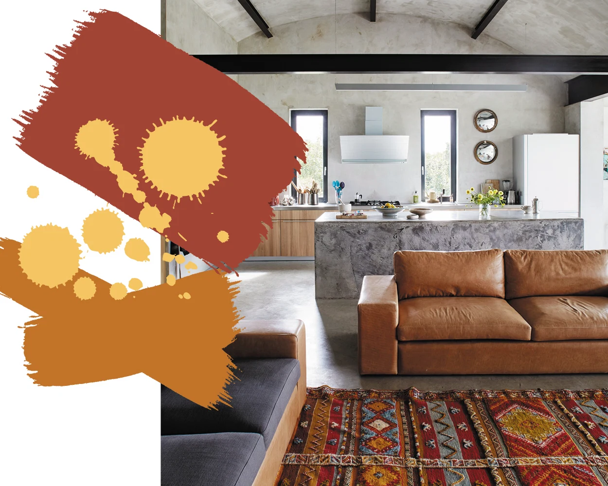 An analogous colour scheme utilises three colours in a row on the wheel, two of which are primary and the third secondary. Below, the rug is used to pull together the tan leather of the sofa and the natural timber of the kitchen units, while bringing out the texture in the concrete walls.