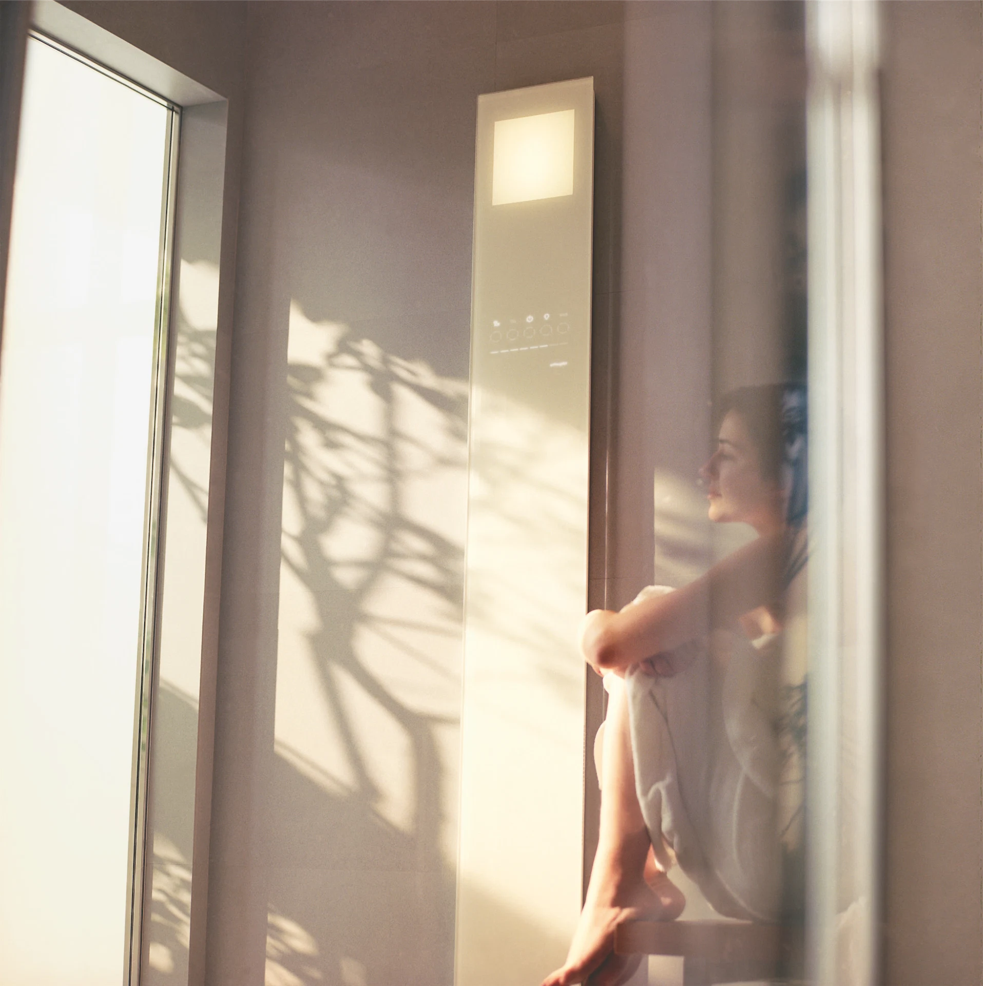 An elegant panel of silk-screened tempered glass conceals state-of-the-art technology, providing perfect steam bath functions, including steam generation, chromotherapy, aromatherapy, music and touch-screen backlit icons.