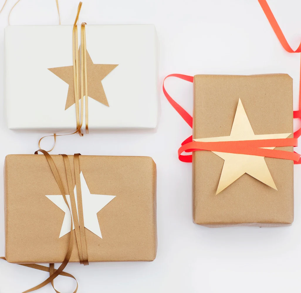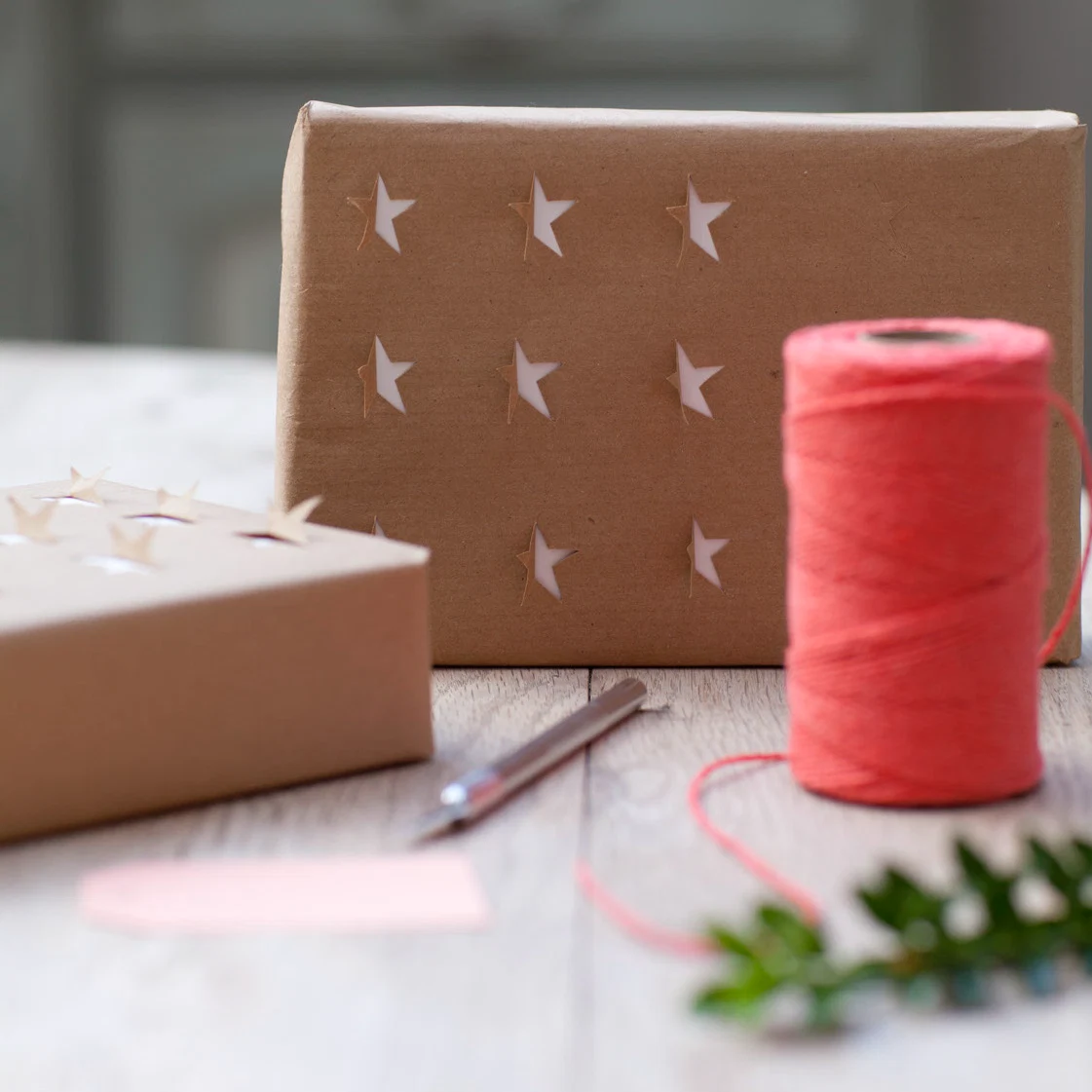 On the underside of your paper, draw a series of stars. Using a scalpel, cut cut along the outline of one side of the stars. Tape the card over the paper to cover the stars. This will give the finished look some contrast, and won’t reveal the gift inside! Flip over and bend each star-half forward for a three-dimensional effect. Finish with ribbon if you like.