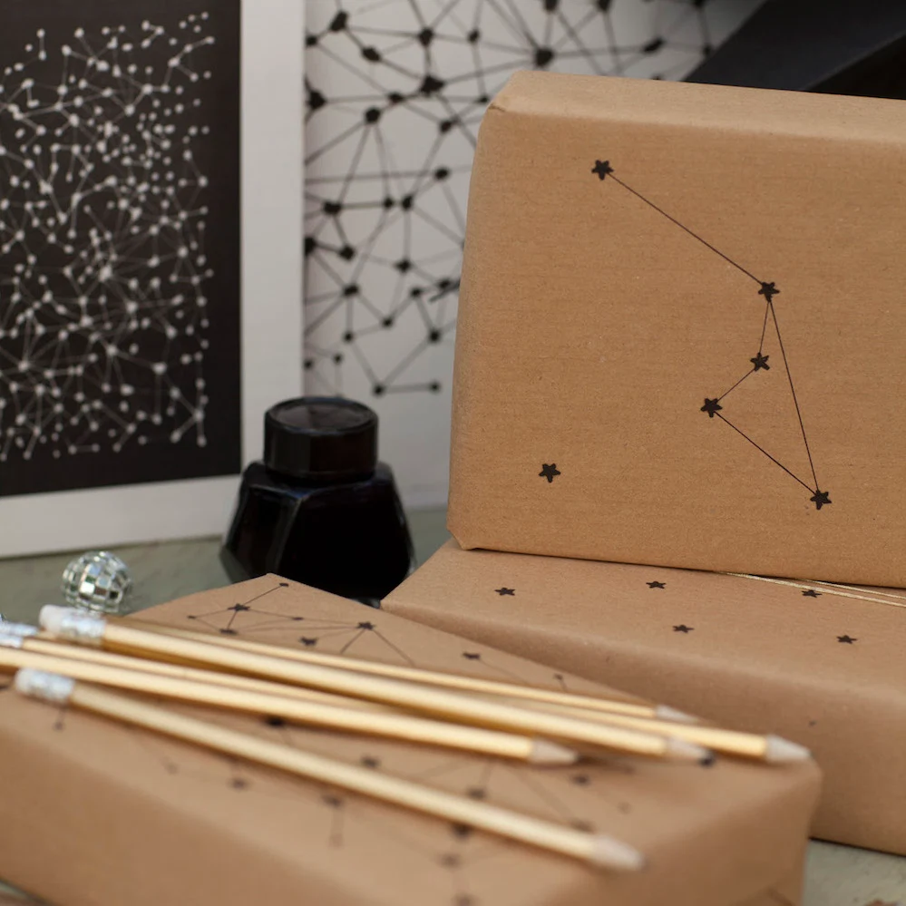 This is a super simple way of decorating any kind of plain paper. Make a star stamp on your pencil rubber and join the dots to create your very own constellation.