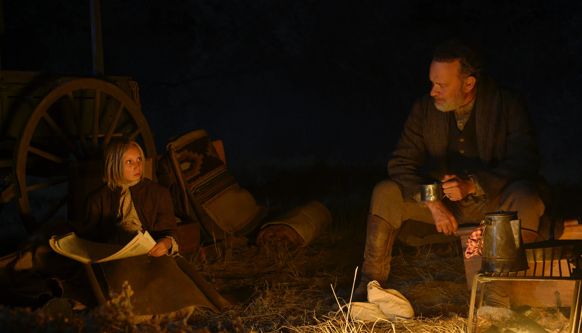 (from left) Johanna Leonberger (Helena Zengel) and Captain Jefferson Kyle Kidd (Tom Hanks) in News of the World, co-written and directed by Paul Greengrass.