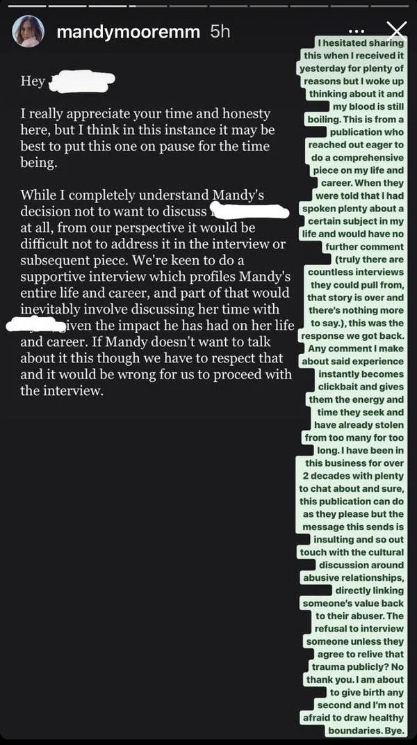 The journalist/publication wrote that the interview would have to be put “on pause” if she wasn’t willing to talk about her past abuse, saying “it would be wrong” to run a story about her career without including those details: “If Mandy doesn’t want to talk about this though we have to respect that and it would be wrong for us to proceed with the interview.
