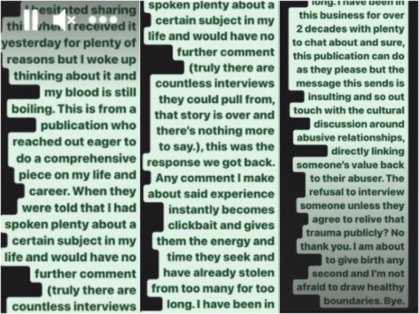 “The refusal to interview someone unless they agree to relive that trauma publicly? No thank you. I am about to give birth any second and I’m not afraid to draw healthy boundaries. Bye.”