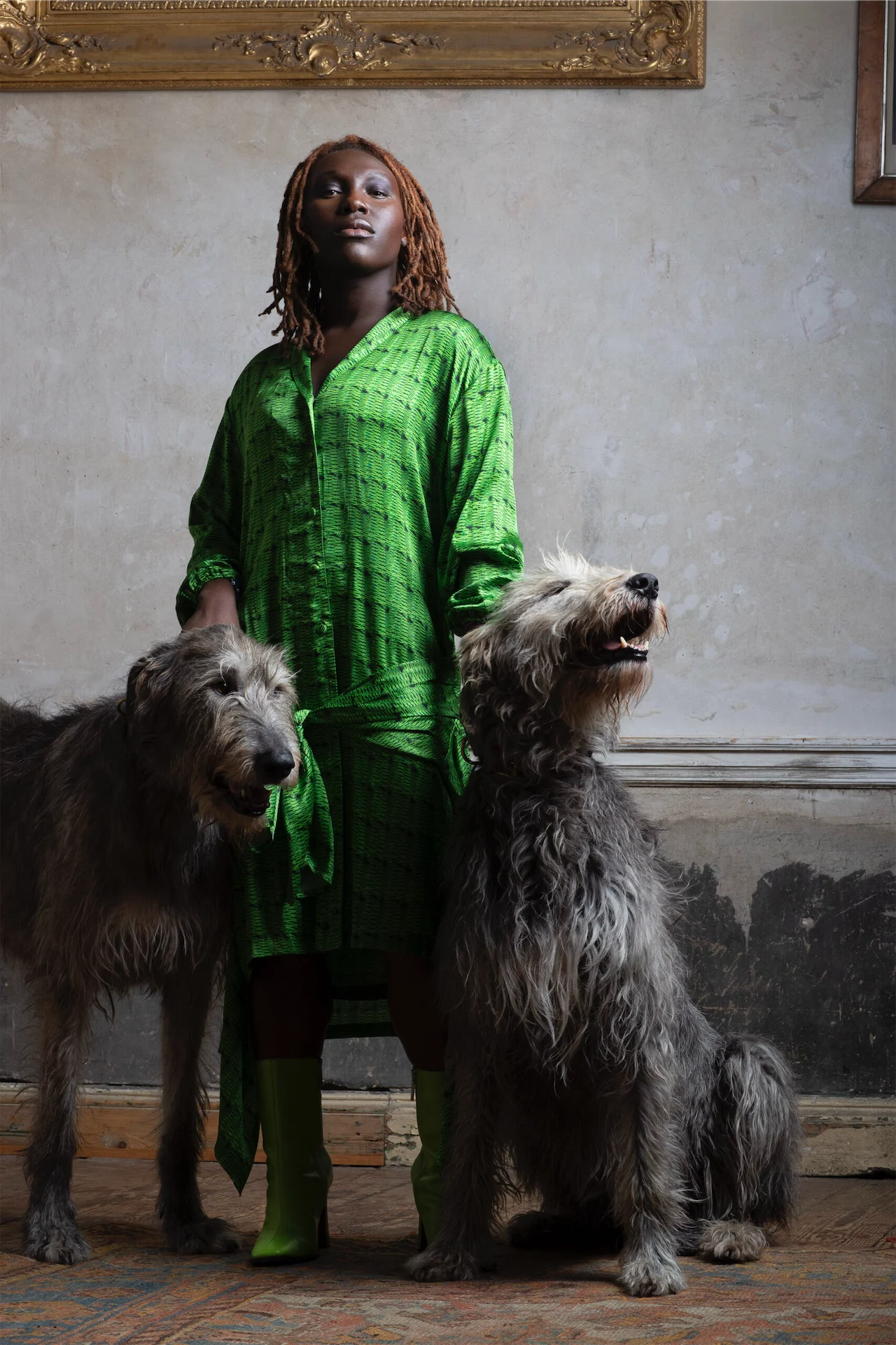 “I wanted Anne Devlin portrayed by someone that I felt had two parts to them. We chose Felispeaks, as I felt as a poet she had a great voice in herself, but I loved that idea of Felicia being the voice of the new generation of Irish and a new powerful voice for Black and Irish. With Felicia we shot her with two Irish Wolfhounds, as Anne Devlin was buried with Wolfhounds on her grave as a sign of loyalty to Robert Emmet. We dressed her in Helen Steele, with strong green tones to represent that new Irish voice.”