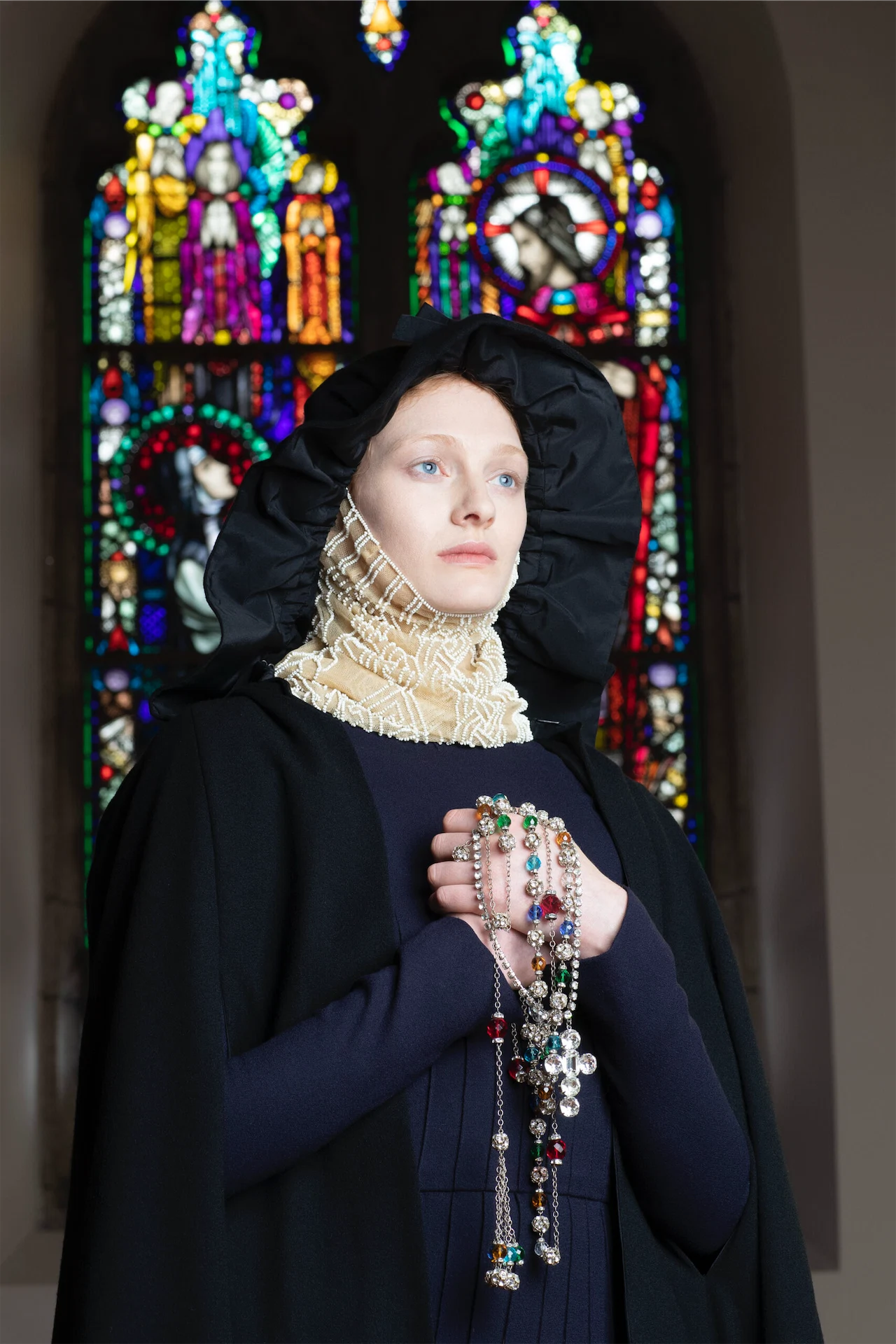Catherine adds “I adore Áine’s delicate look and again she was a perfect match to be dressed in Peter O’Brien who is well known to love ‘nun’s’ style clothing! He immediately thought to use the wonderful full length wool dress and then topped it with the black cape from his Couture collection…. The ‘wimple’ is actually a Lesage embroidered silk tulle polo shirt pinned upside down (!) and accessorised with jewelled rosary beads from his 1986 collection when he was at Chloe. We had great fun as you can imagine!!”