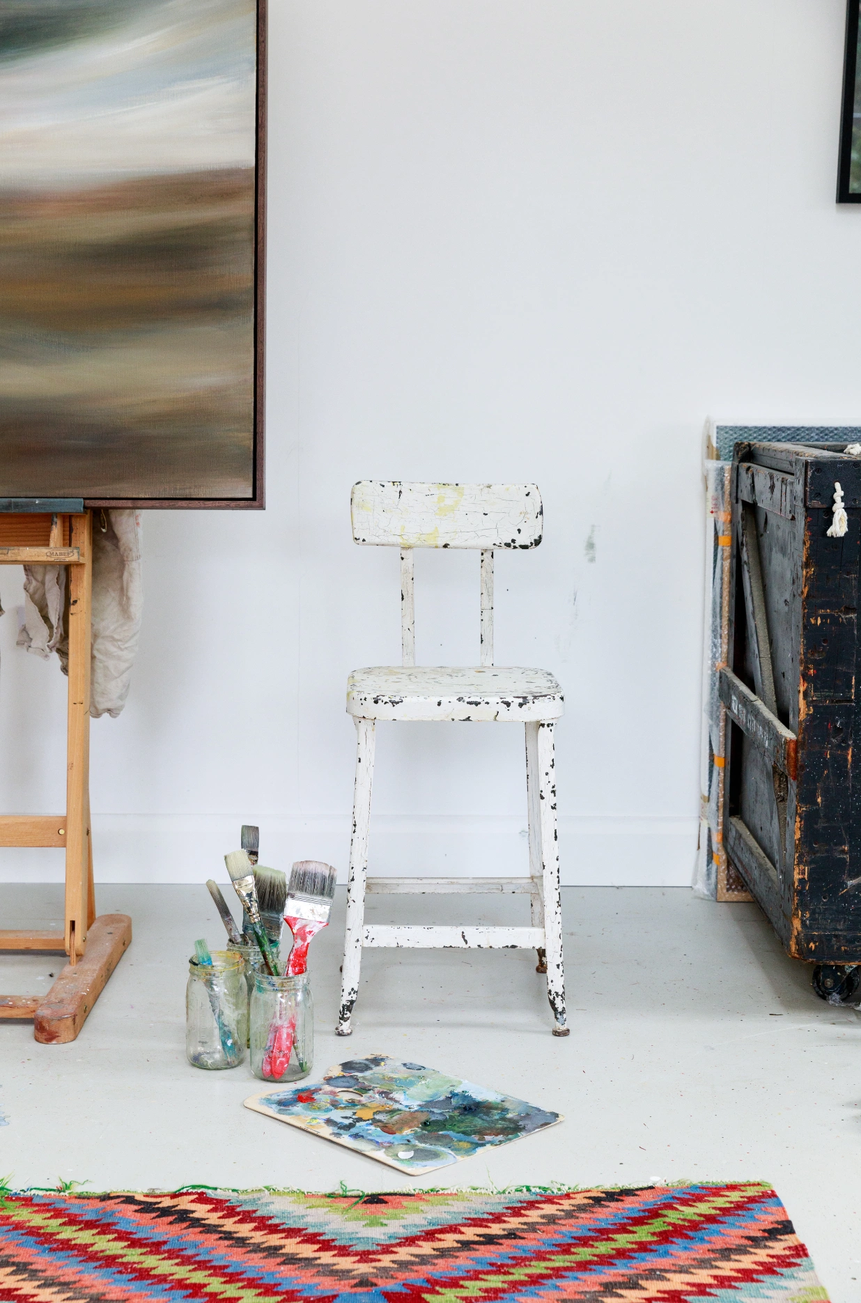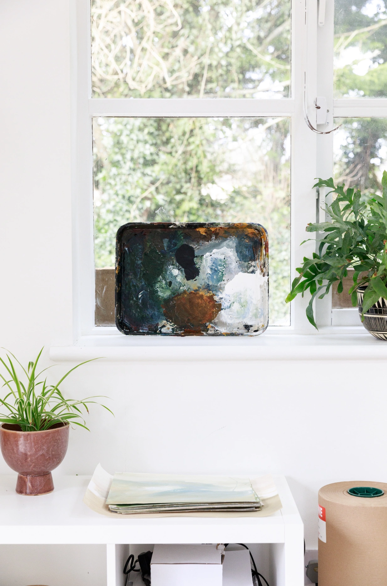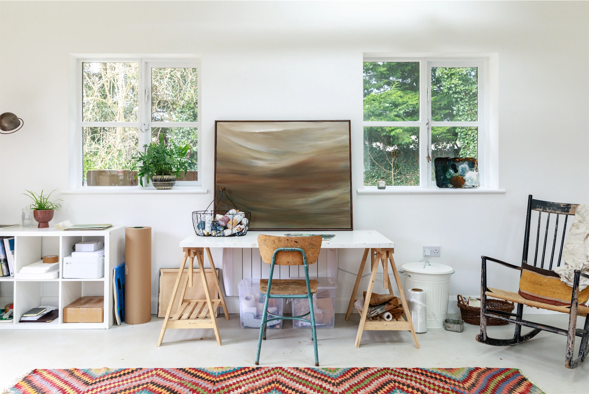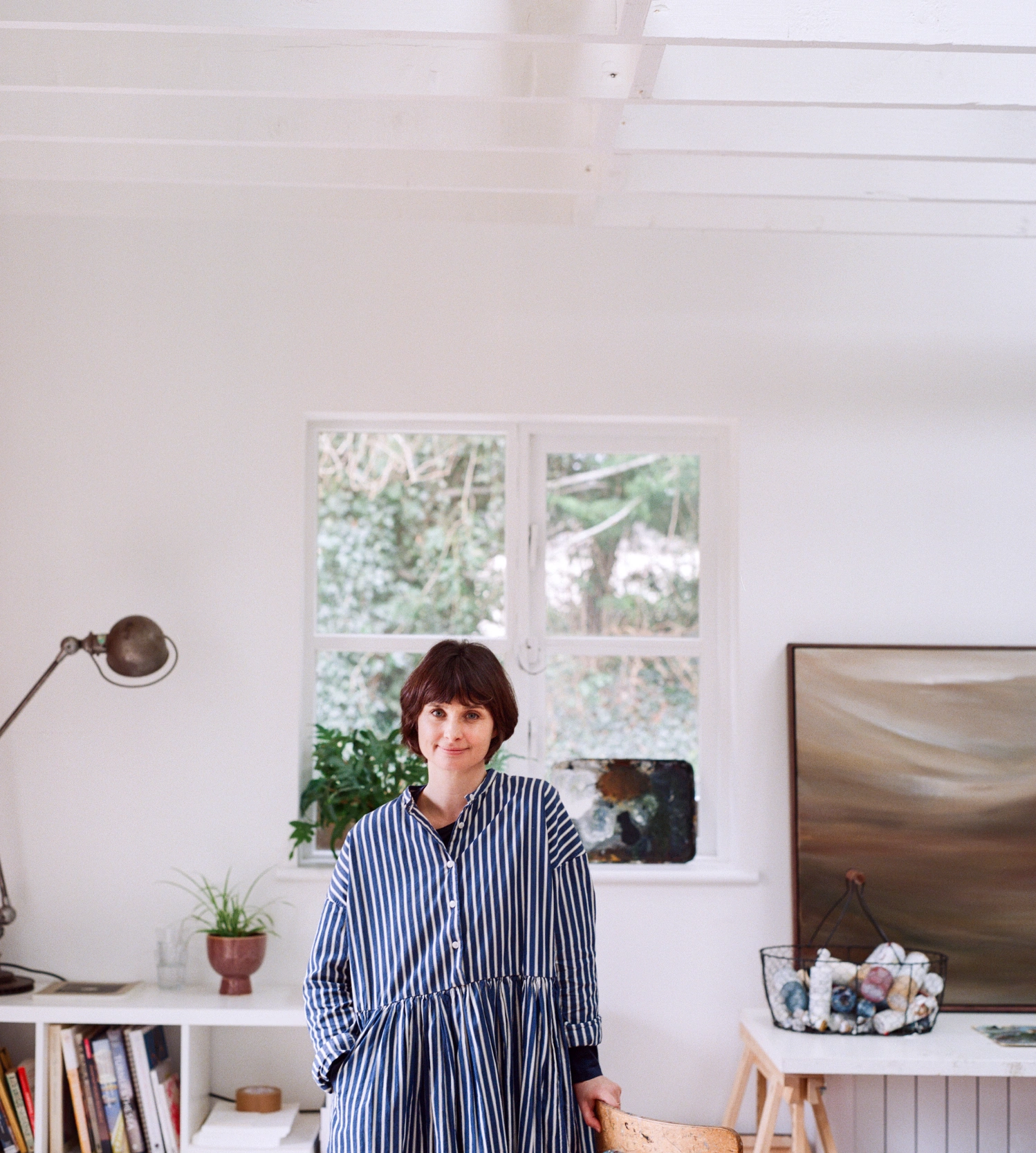 Arriving in the depths of a winter lockdown, with their two daughters, Robyn and Simone, they set about transforming the workshop into a studio almost immediately. “Rich insulated it and plastered it,” says Petria, “and we put the skylights in to bring in more light. Then we painted everything white, so we had a clean background from which to work on.”