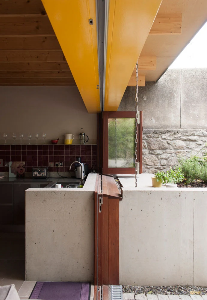 KEY MATERIALS Concrete (they wanted to leave the concrete walls exposed internally and externally, requiring a very fine level of finish), steel (the detailing of the deep, brightly coloured beam, spanning the full width of the room, enhances the connection with the garden) and timber.