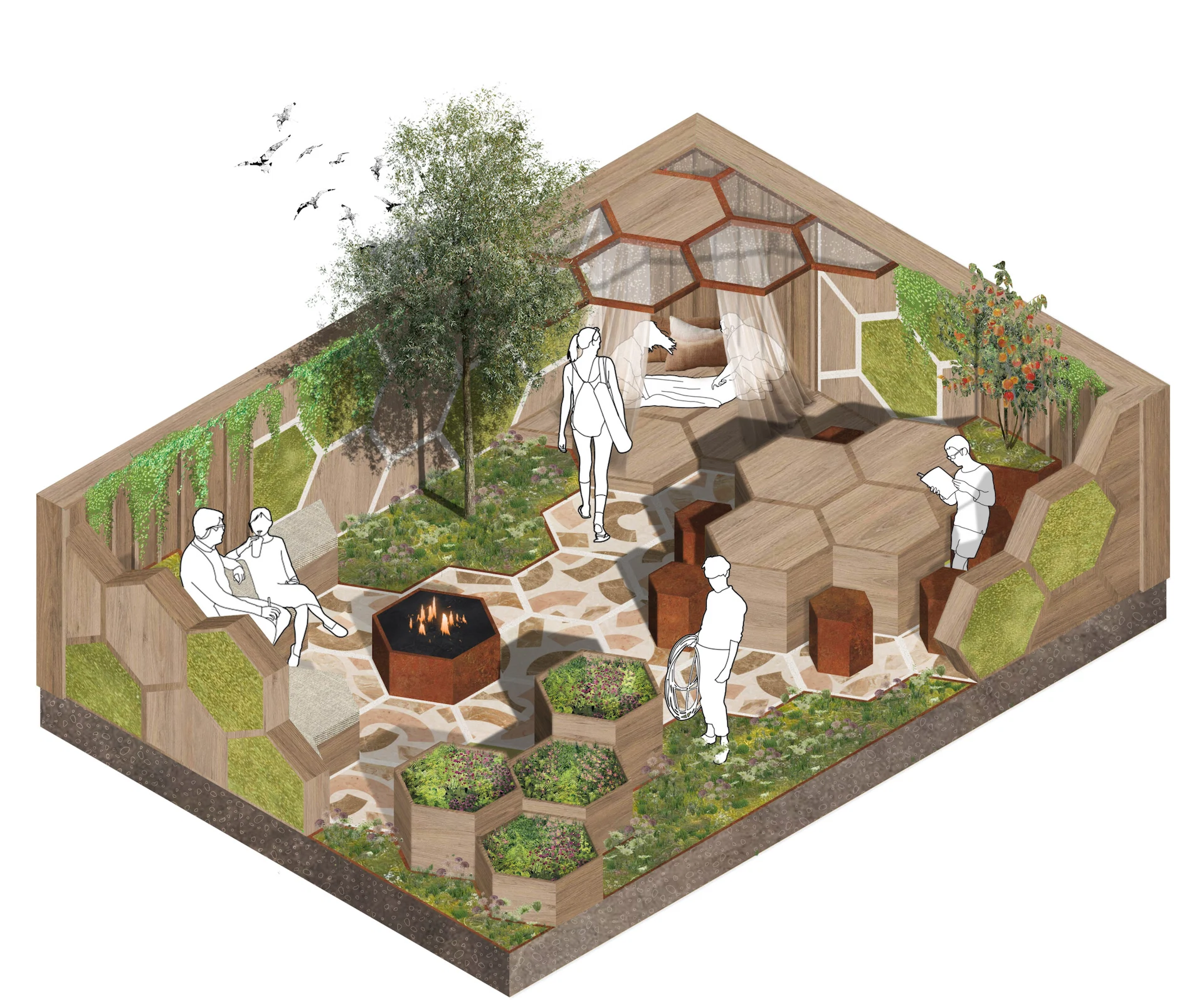 When I applied for this garden at Bord Bia Bloom, I knew it was going to be very small and so I decided to try to find a solution so that I could achieve the most out of a small space. The outcome of that was this hexagonal pattern that you can see in the design render of my garden. It is a very simple pattern that is commonly seen in nature but it really allowed me to create a very efficient use of space. I’m interested in gardens that do not just look good, but also give back to the space in terms of sustainability and biodiversity, so the honeycomb pattern created with this shape shows this connection to bees and nature in this design.