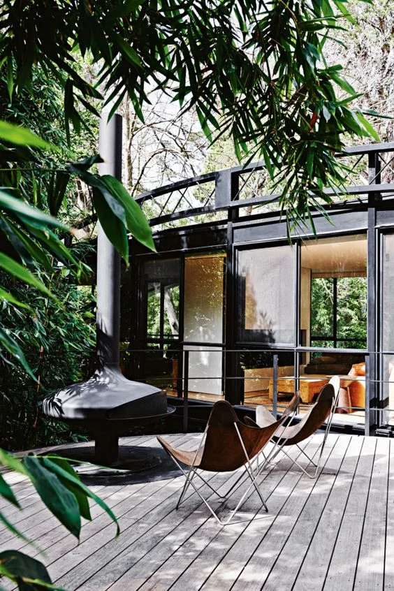 Leafy tropical plants soften up this modern decking, and who wouldn’t want to get comfortable in those butterfly chairs once the sun sets and the fire pit gets going?