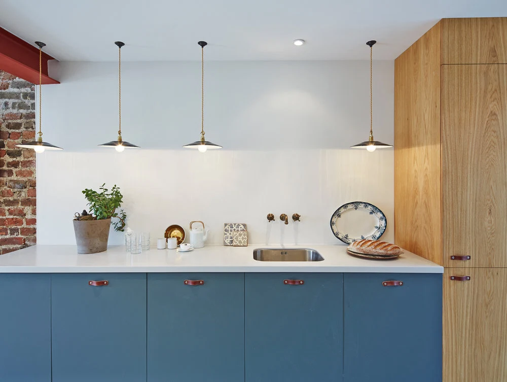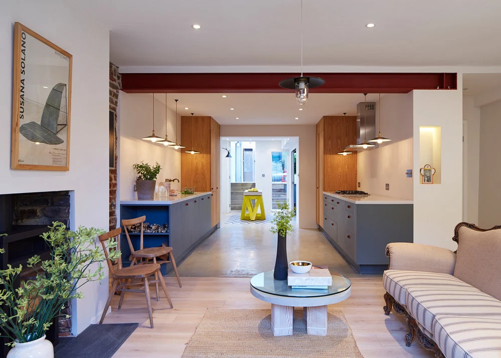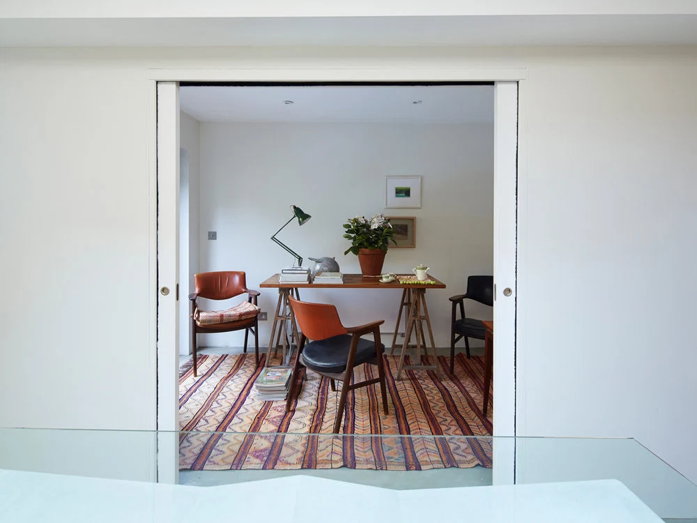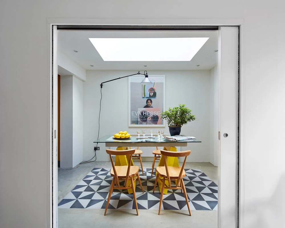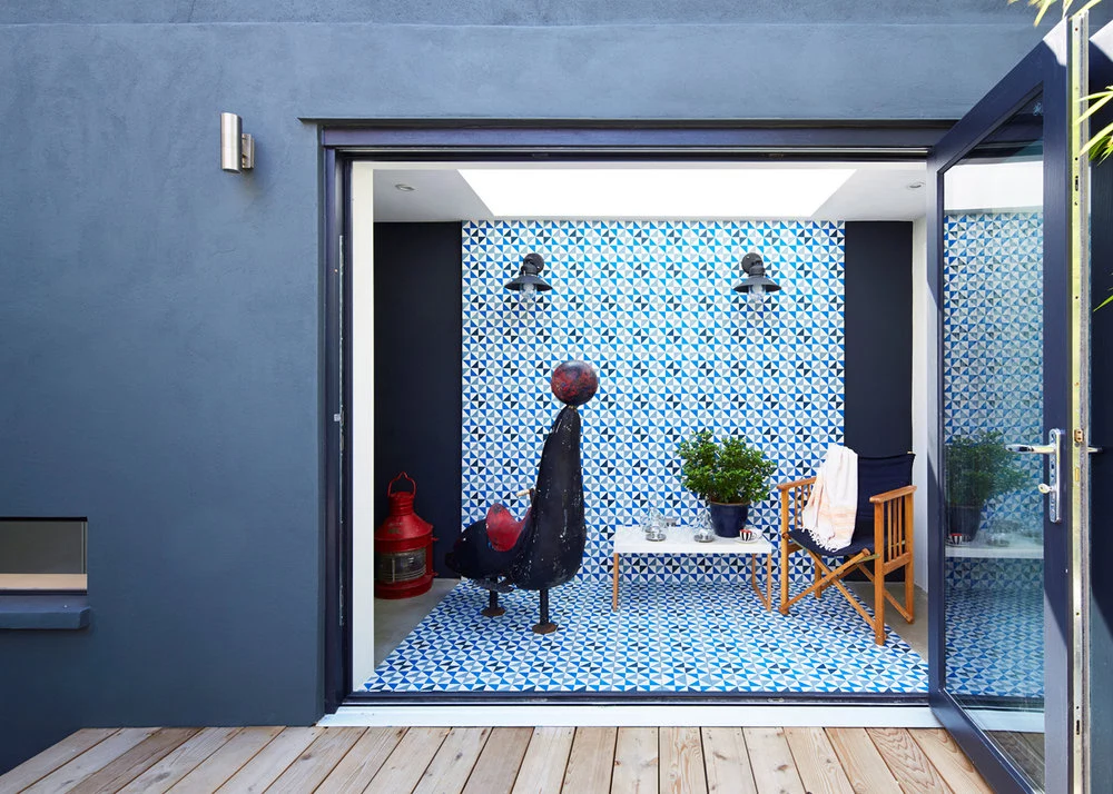 The Blue Tile House, originally a one-bedroom plus garage and an outhouse hovel, is now a glamorous, light-filled and imaginative three-bedroom space that their Zürich-based clients use when in London.
