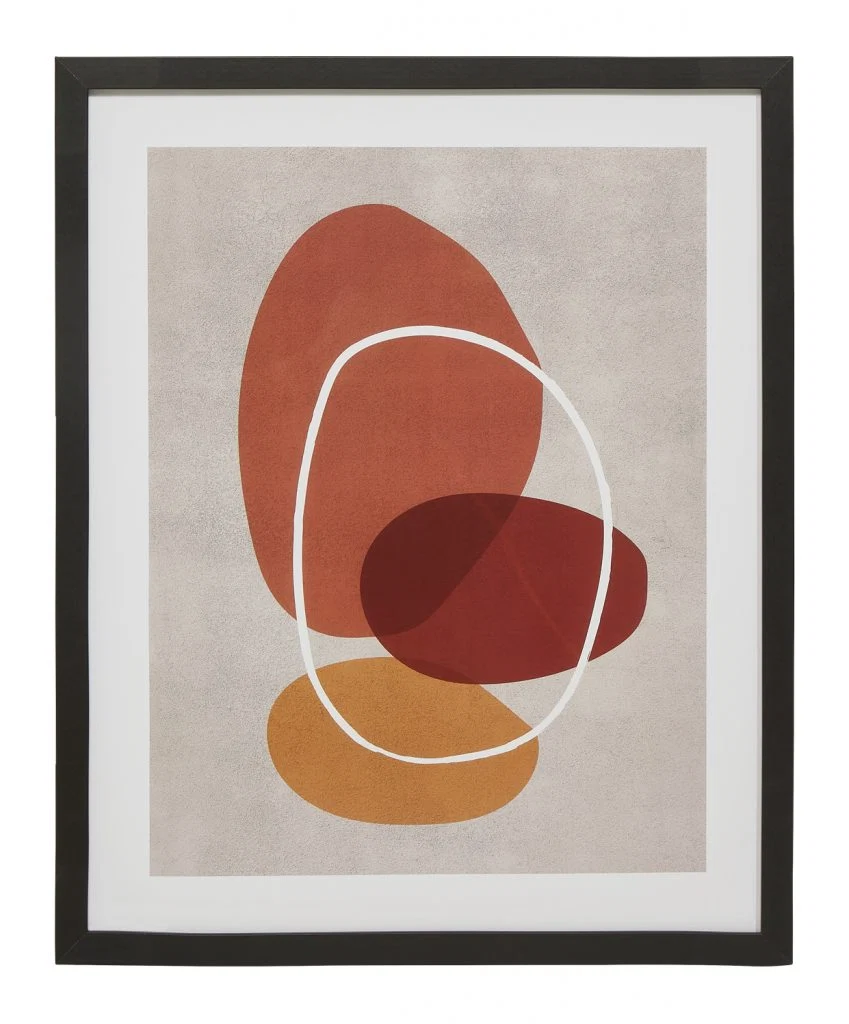 Add some autumnal tones with this abstract circles framed wall print, €26.99. Combine with other pieces or hang alone for a clear pop of colour.