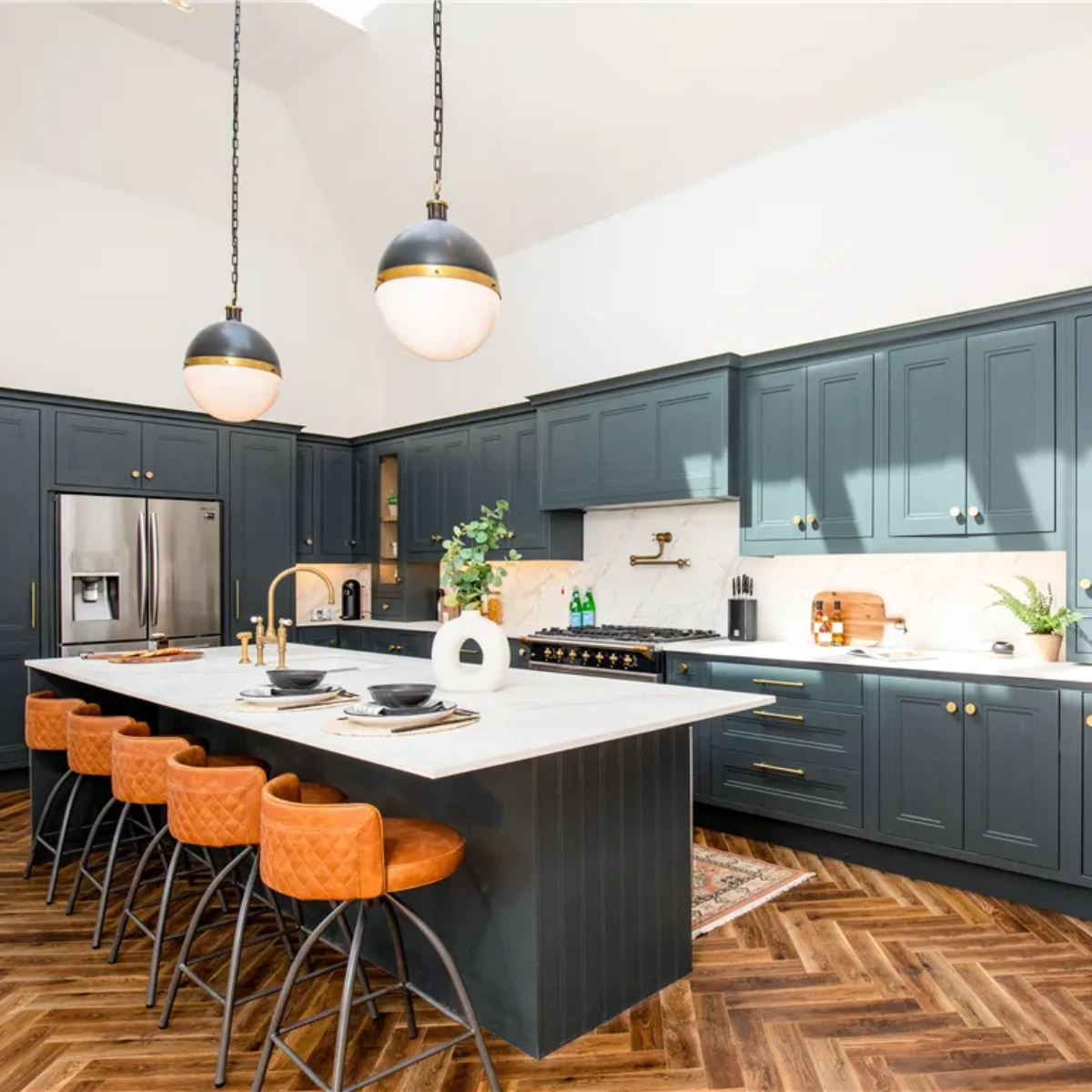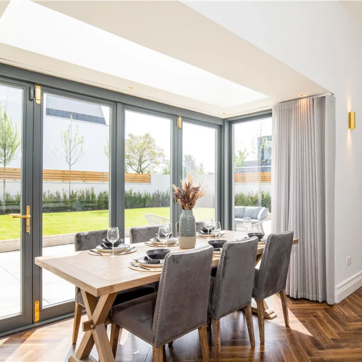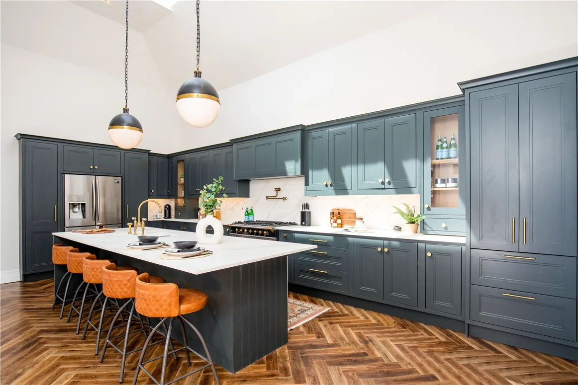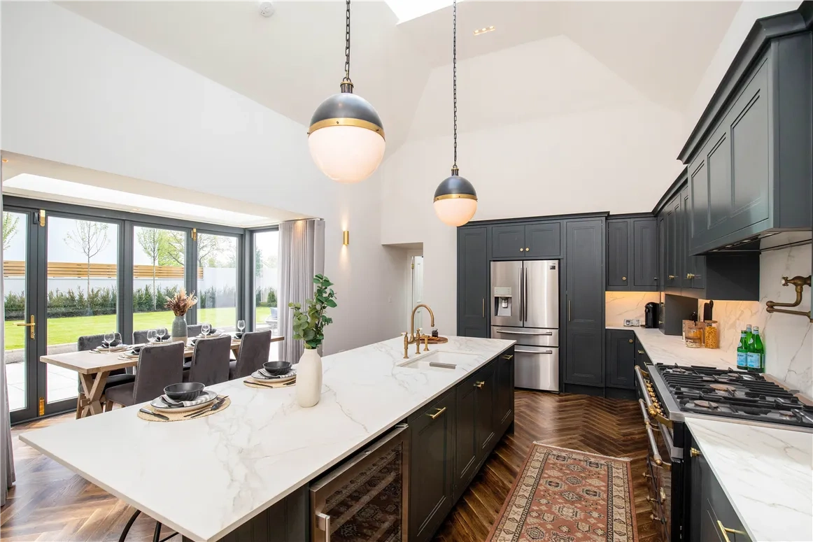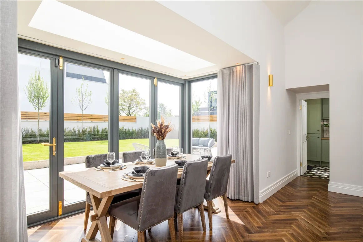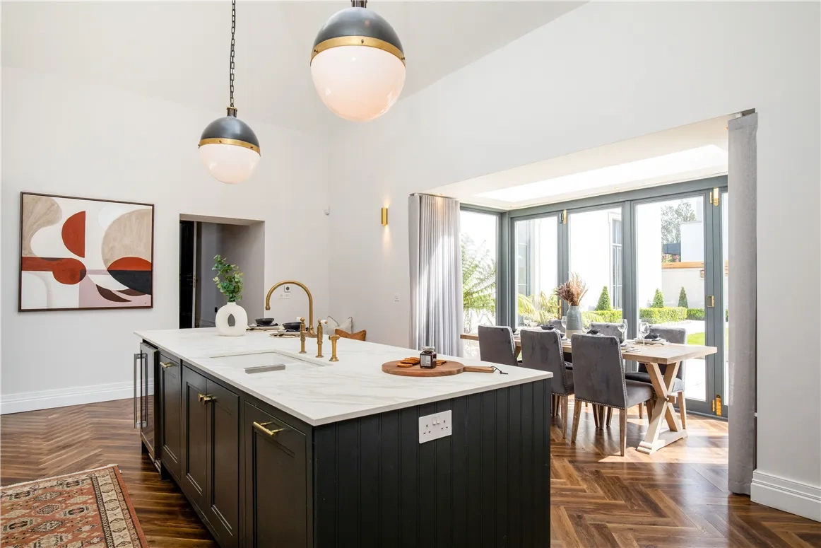 The kitchen-cum-dining room is a bright and spacious room, opening to roof height. Custom cabinetry in the form of high and low level fitted units line the walls. A generous marble-topped island with sink, wine fridge and seating sits in the centre of the room with a dining table and chairs positioned in front of a custom bay window with floor-to-ceiling glass doors.