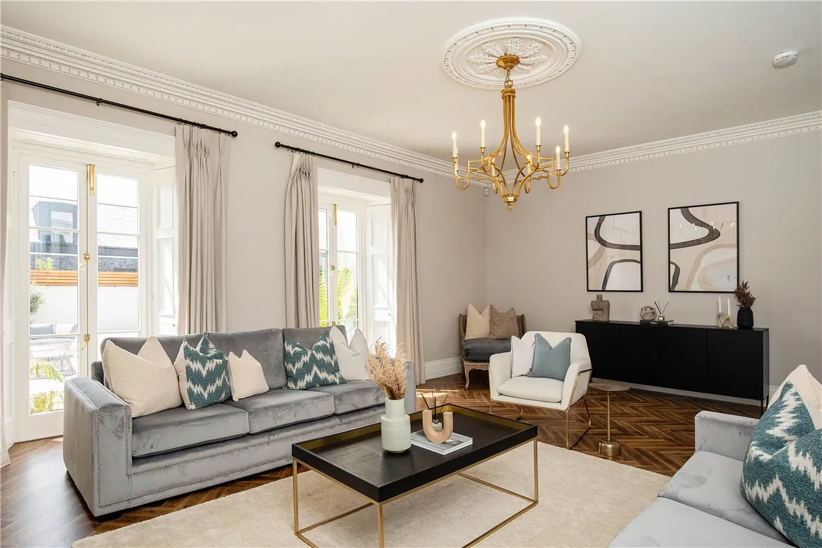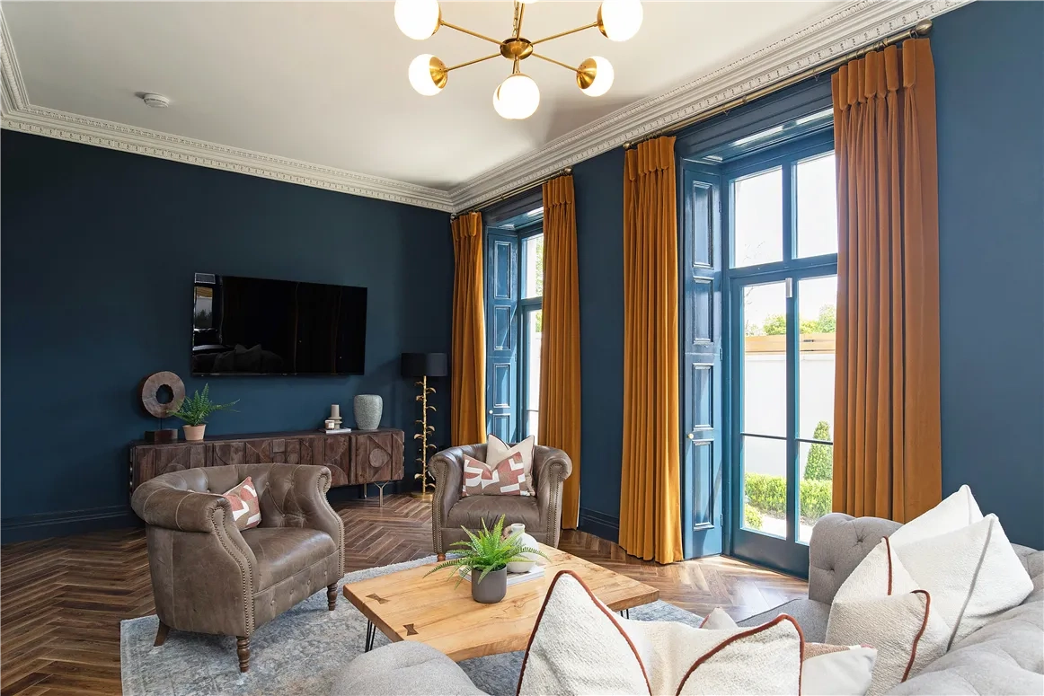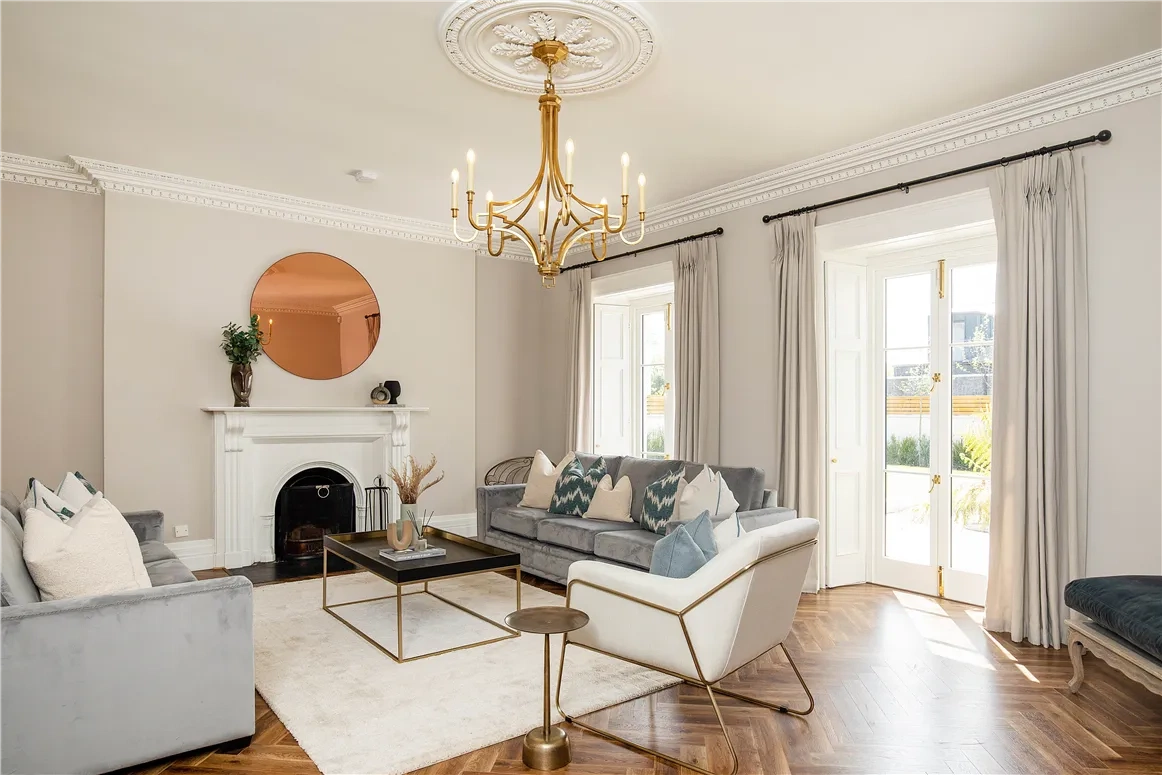 To the left of the entrance hall is a second reception room, decorated in warm tones to provide a cosy and comfortable family space. Flooded with natural light courtesy of four French windows, two on either side, this room also features its own marble fireplace and opens out onto the rear terrace.