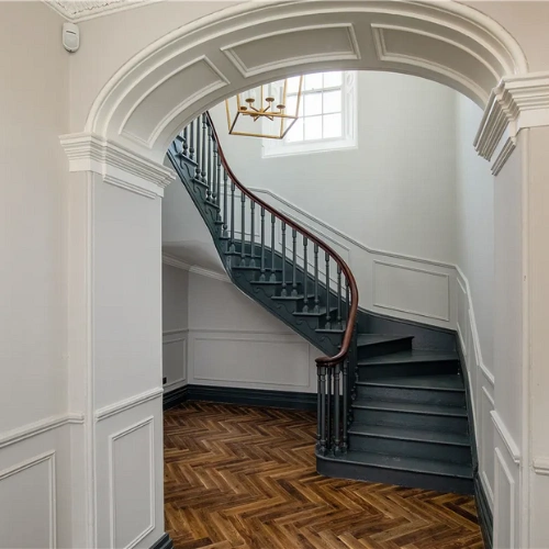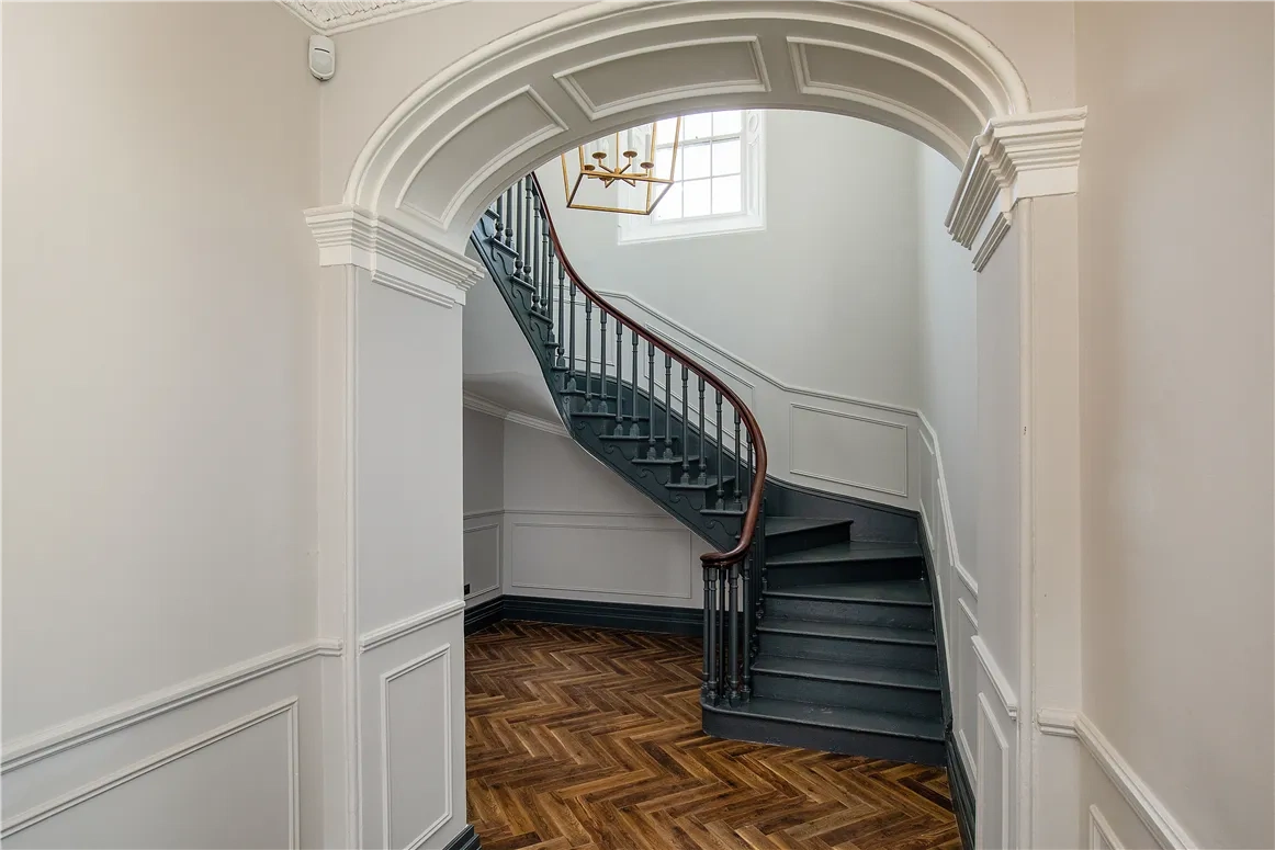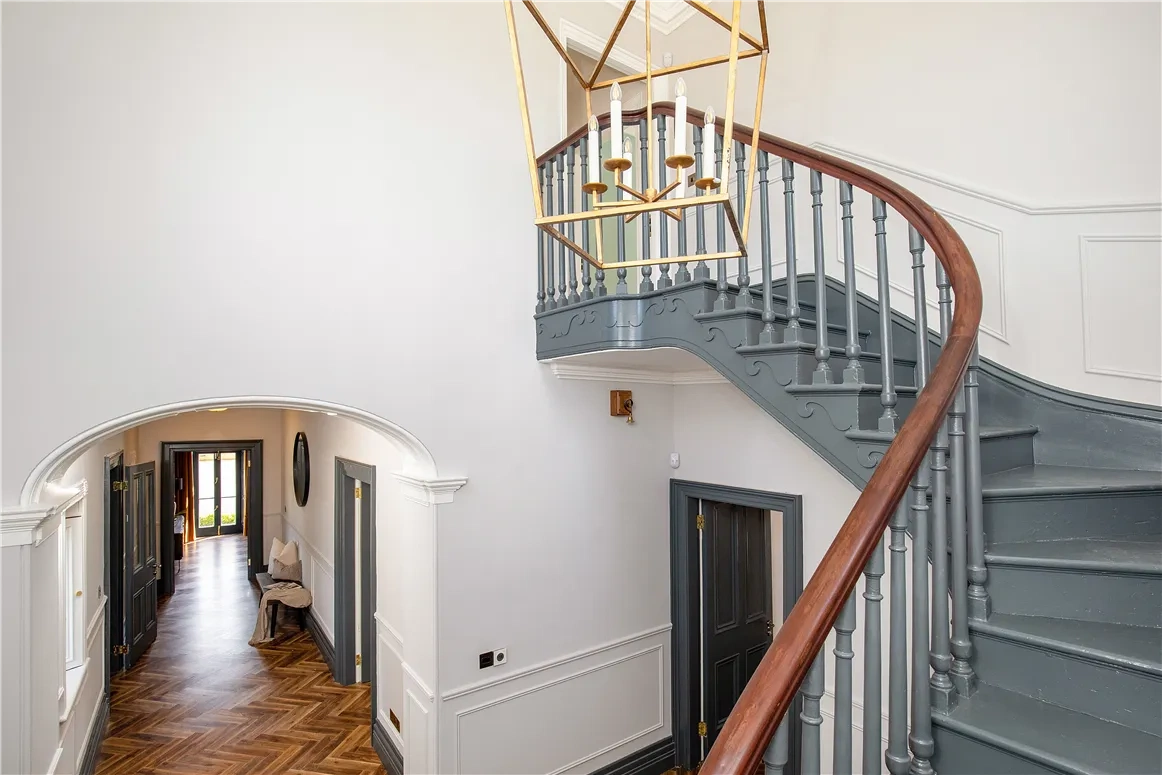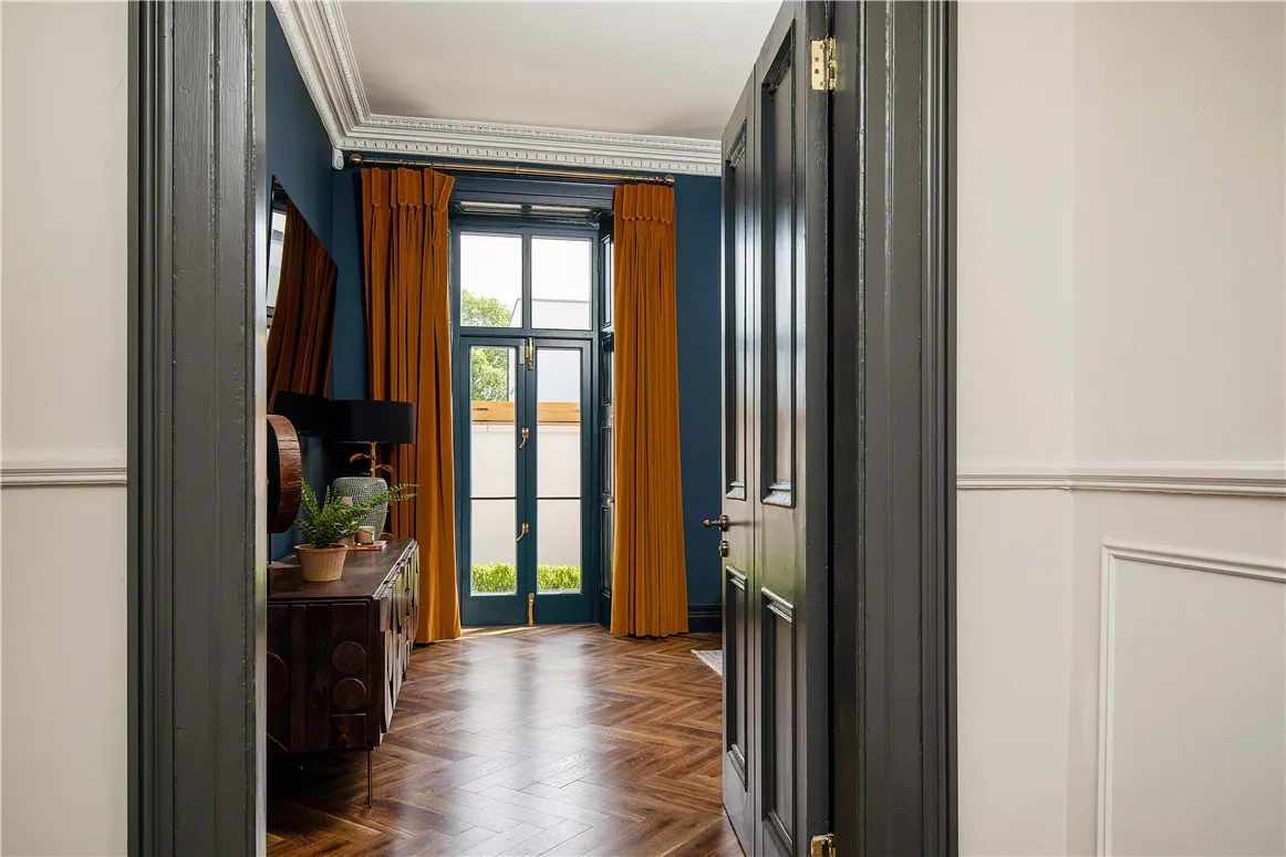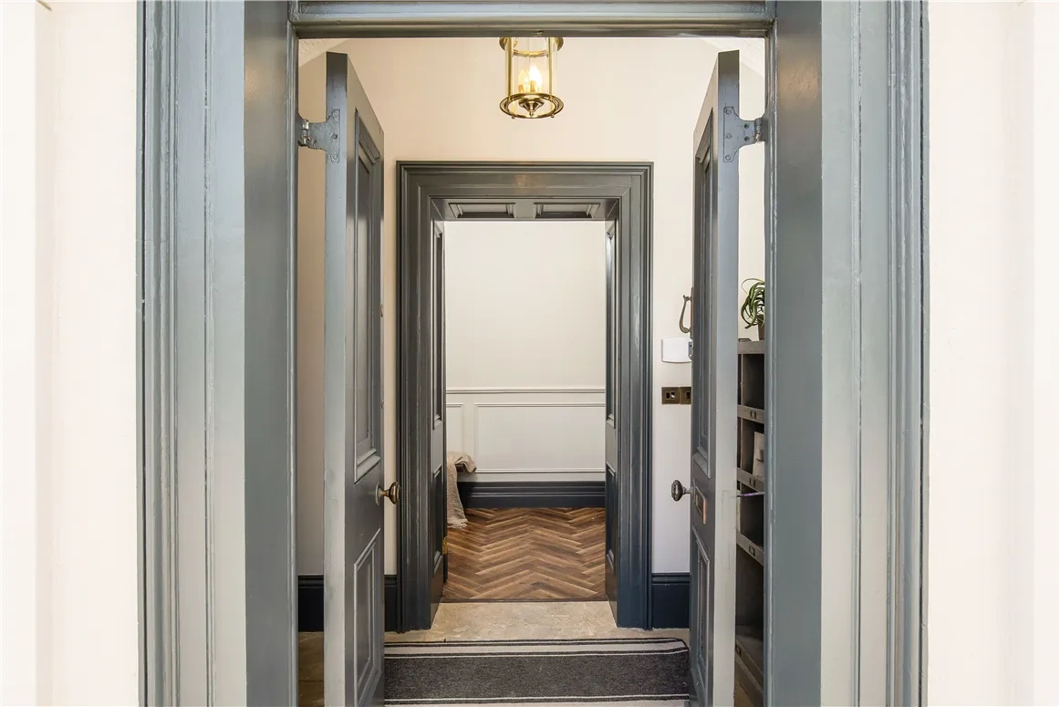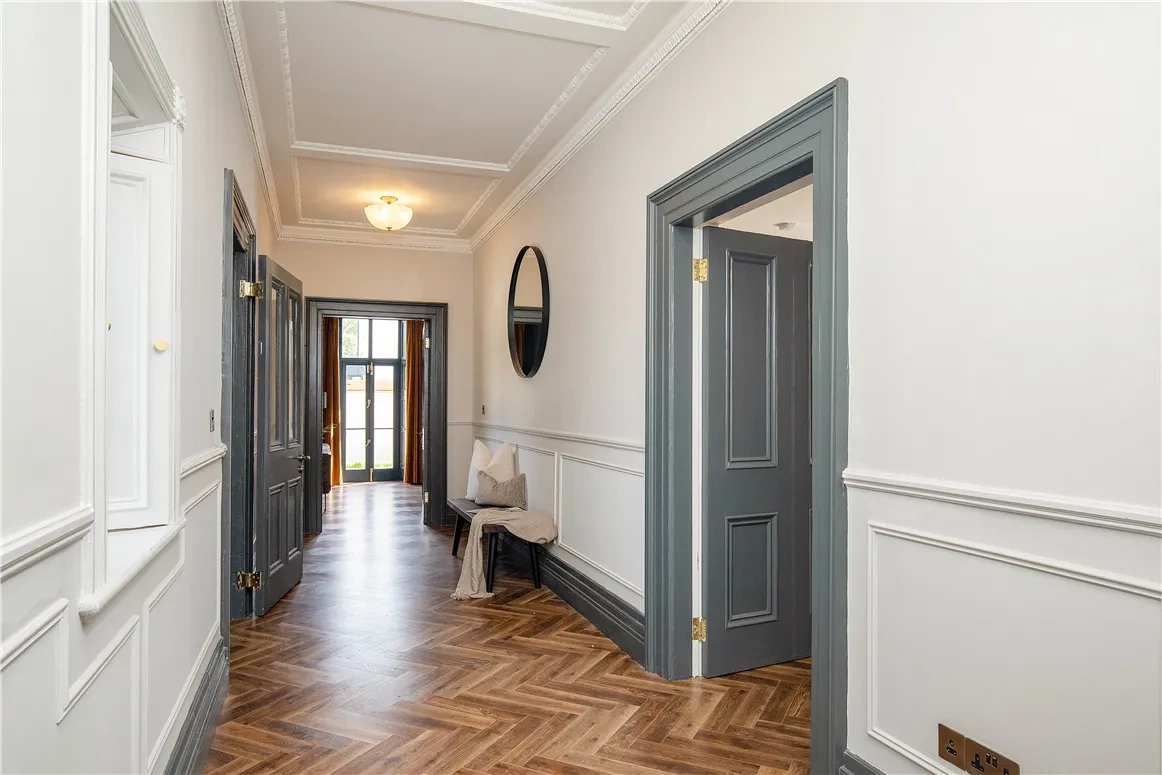 A restored front door opens onto the porch with original floor tiles and storage space to both the right and left. Glass doors lead into the main reception hall with wall panelling and warm solid parquet flooring. This continues inside to the central hall.