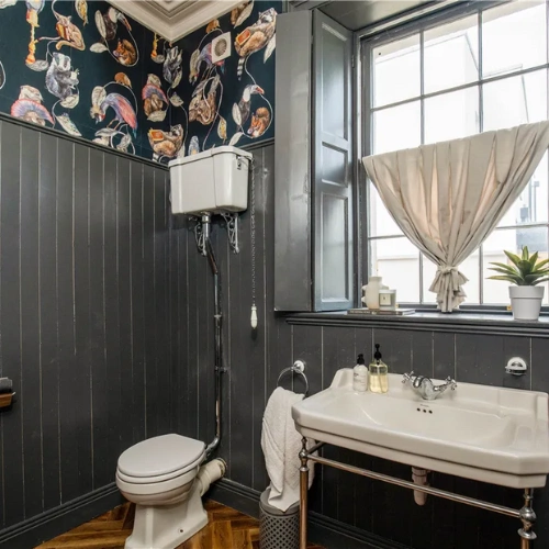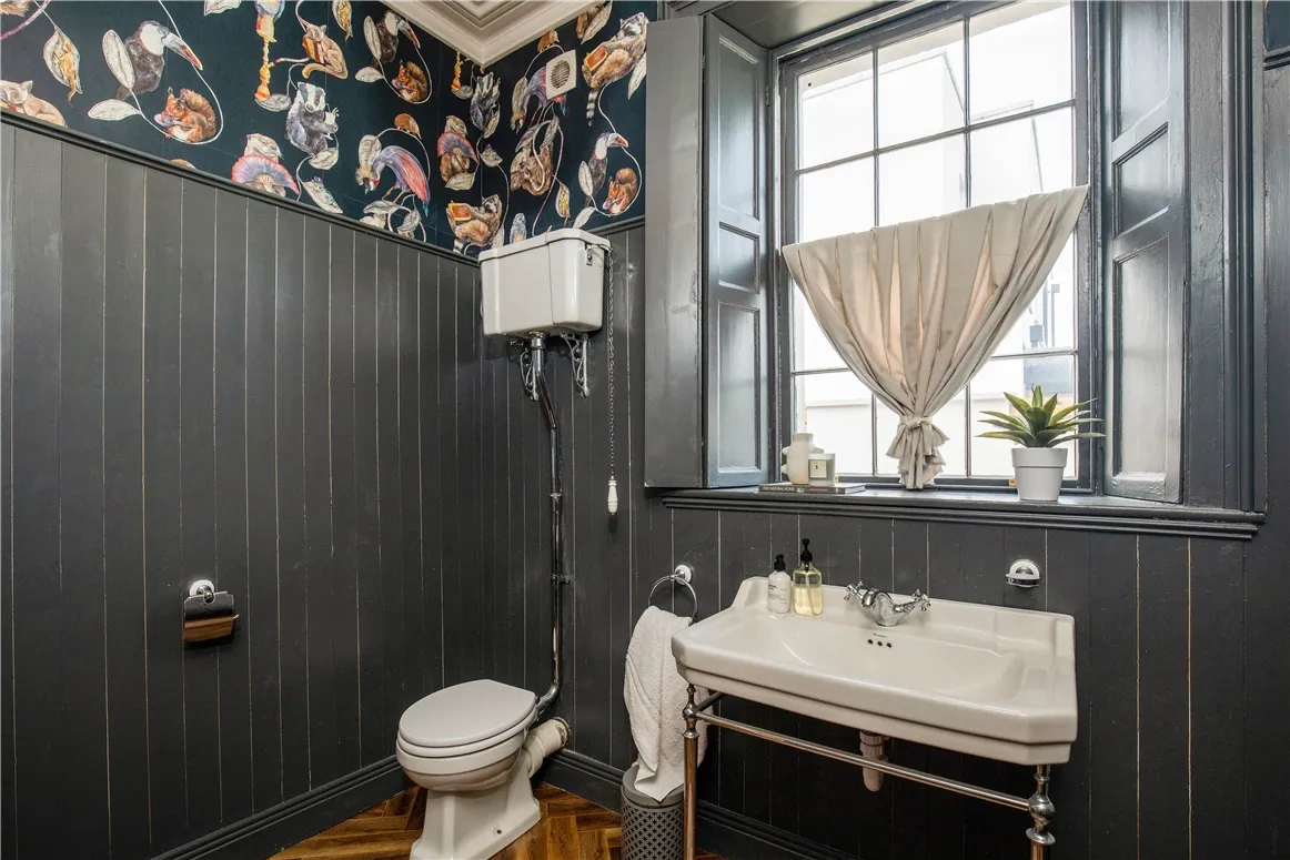 Continuing inside through the central hall on the way to the kitchen, you’ll find a guest bathroom – panelled and papered with cabinetry for coats and storage.
