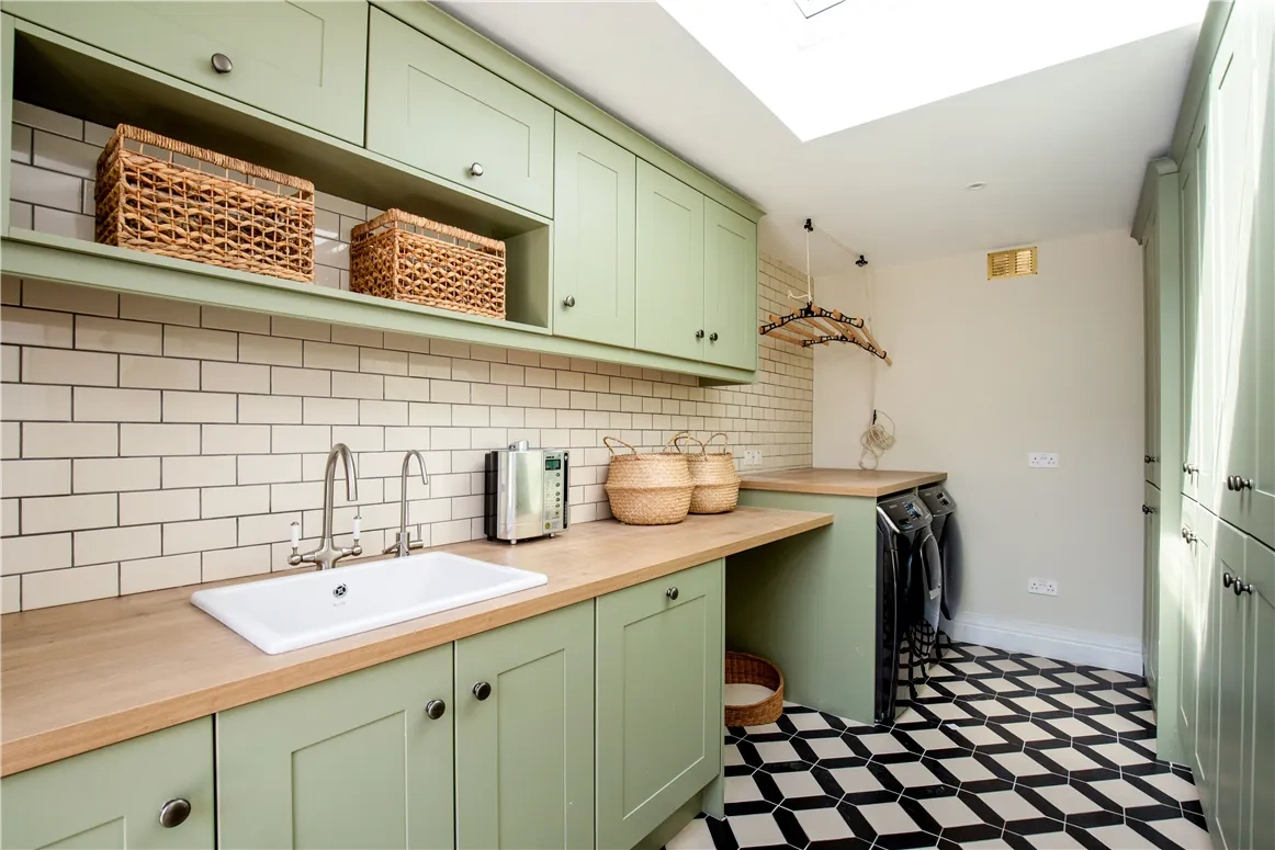 The utility room features its own separate door to the garden and alarm panel, making it a handy family entrance – particularly when it’s raining. Well-appointed with built-in storage and a hanging laundry area, this room has two large-capacity Samsung machines.