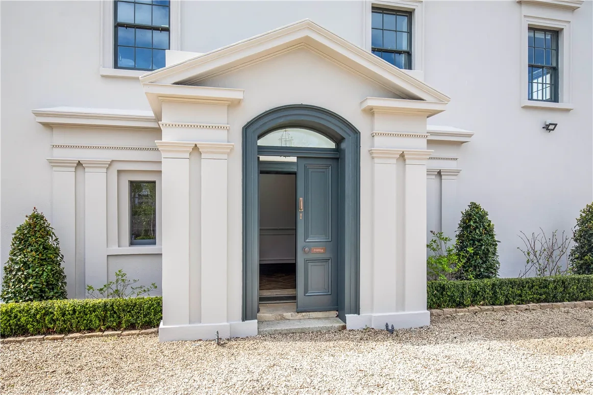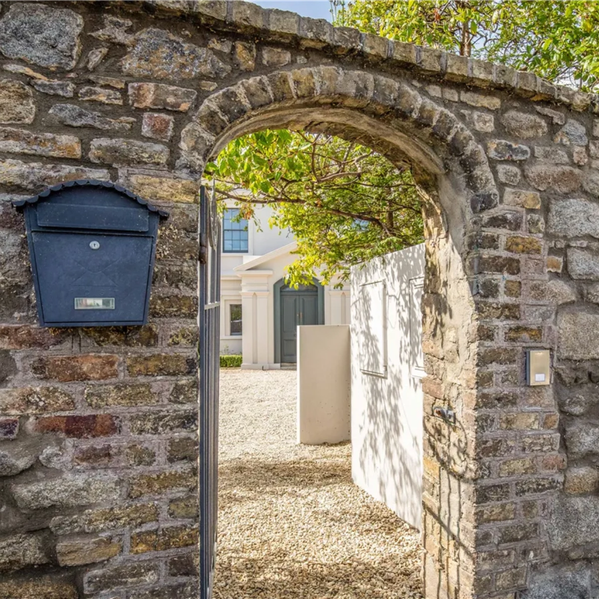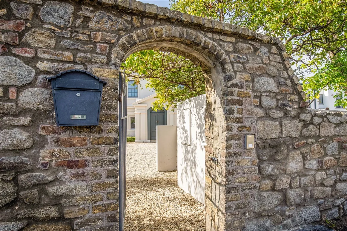 Accessed via private electric gates, a sweeping gravelled driveway leads up to the front of the house where a single-storey porch structure greets you upon arrival. There you’ll find ample off-road parking for up to six vehicles. A pedestrian gate in the original stone wall provides additional visitor parking in the cul de sac to the front, parallel to Upper Glenageary Road.