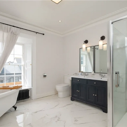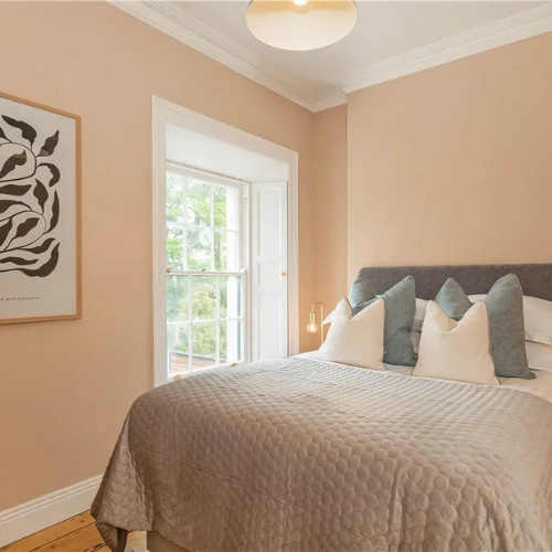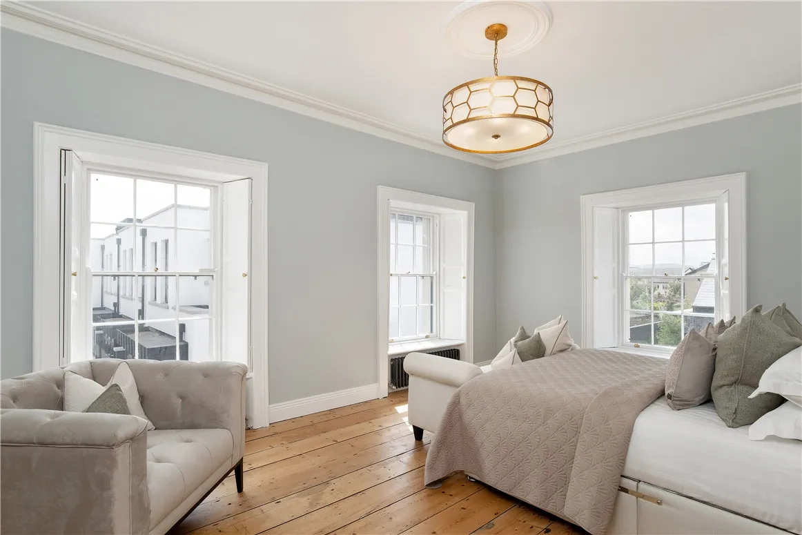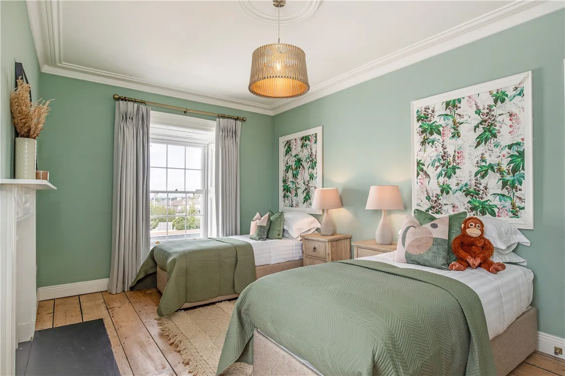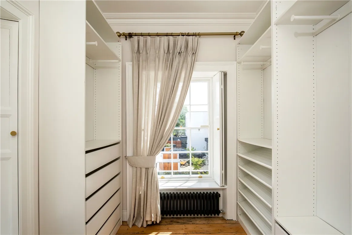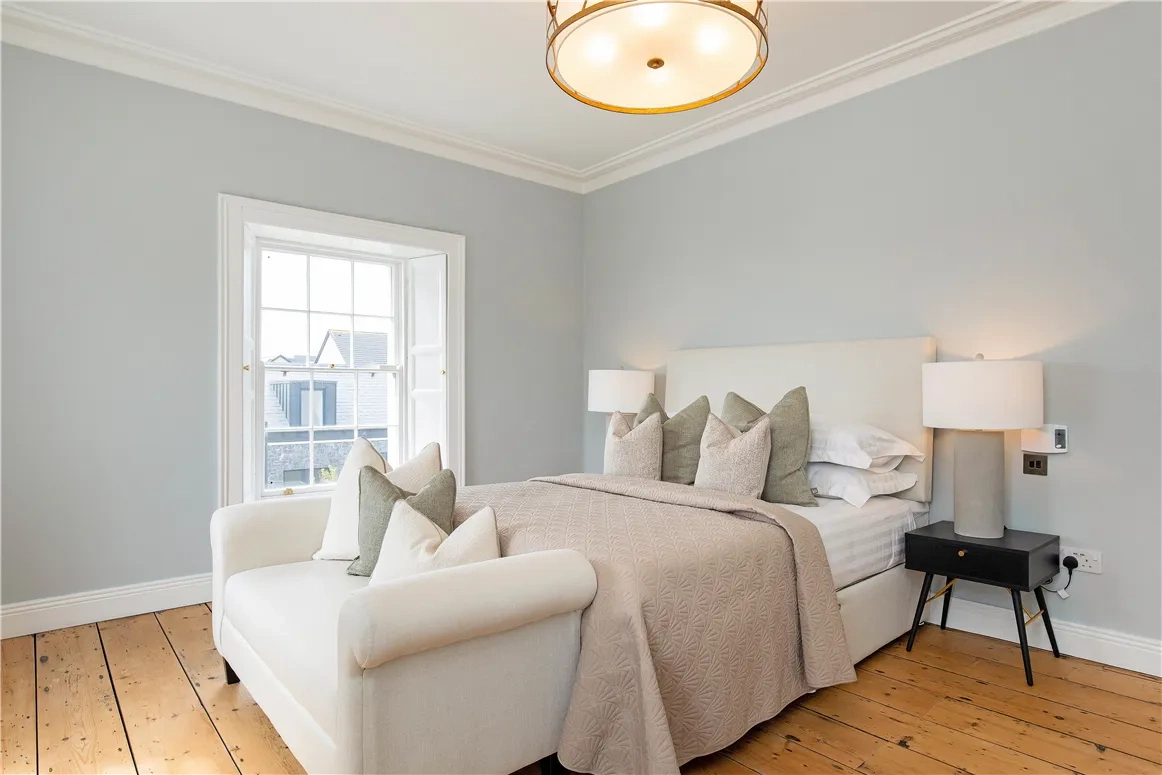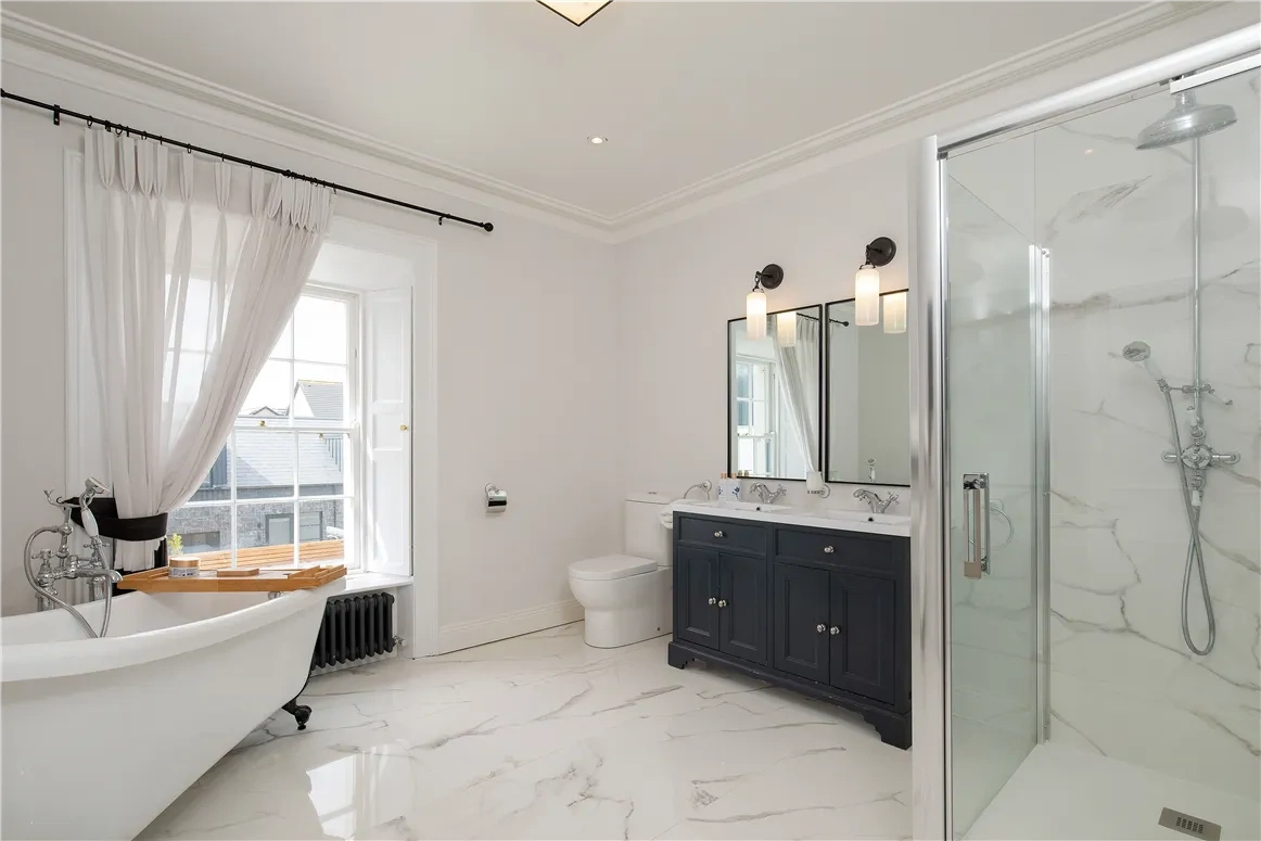 The main bedroom has sash windows on two sides, with an opening leading to a walk-in dressing room – a nursery in previous years. The master ensuite, formerly a double bedroom, has a roll-top bath, walk-in shower, WC and double vanity unit. A sash window overlooks the rear garden.