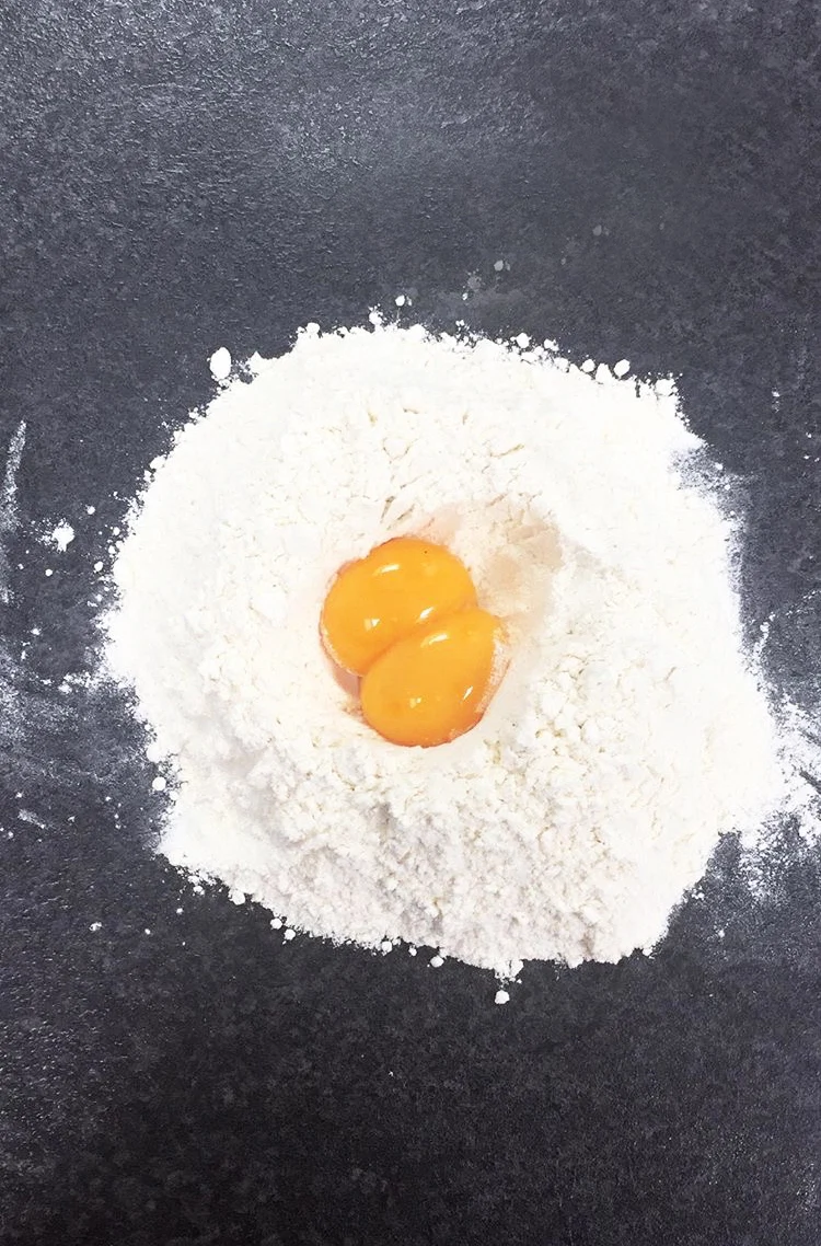 1. Create a well in the flour, add the egg yolks, and use a fork to bind the flour and eggs together. Once the flour and eggs are well combined, knead the dough with your hands until the dough has an almost shiny appearance to it. Then roll the dough out to 1-2cm in thickness, cover in cling film, and pop in the fridge for at least 30 minutes to chill.