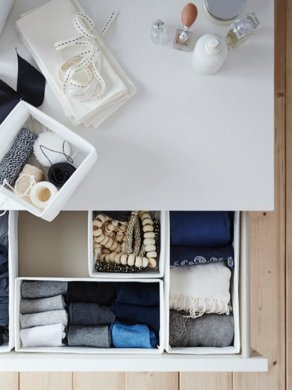 Rather than rooting around in drawers every day looking for what you need, by placing small boxes inside your drawers makes it easy to see at a glace where everything is.