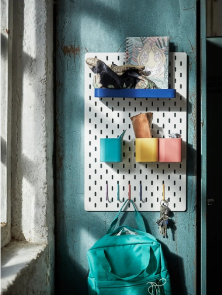 For all those little bits like pencils and small toys, a pegboard with customisable sections is really handy. This one from Ikea works with a whole range of shelves, hooks and buckets, so you can configure it whatever way you like.