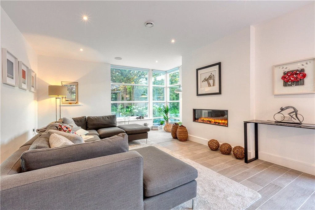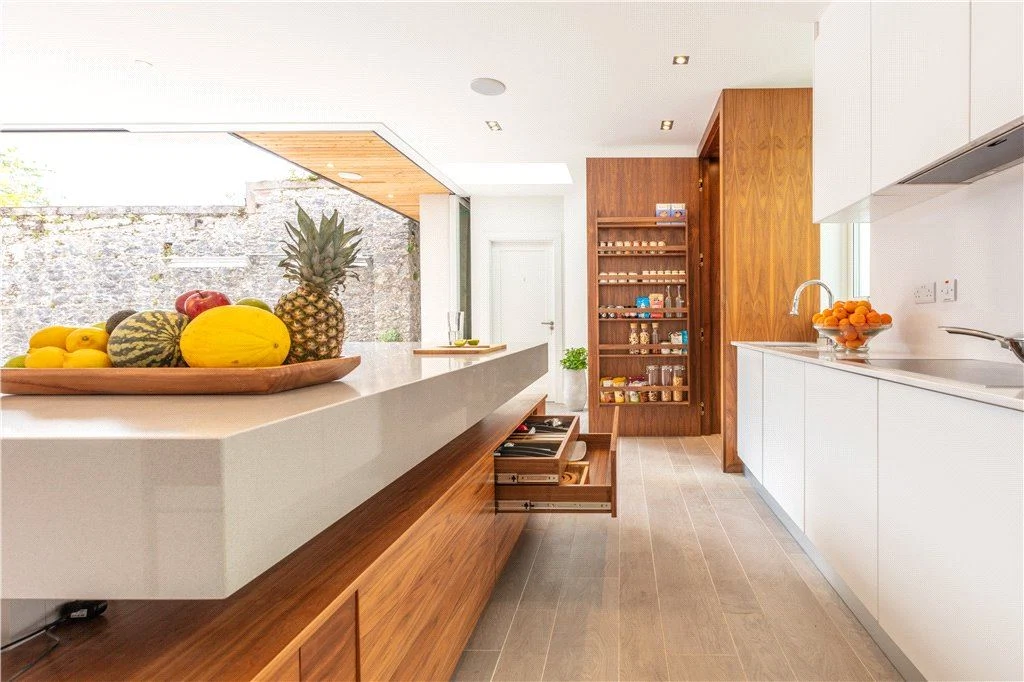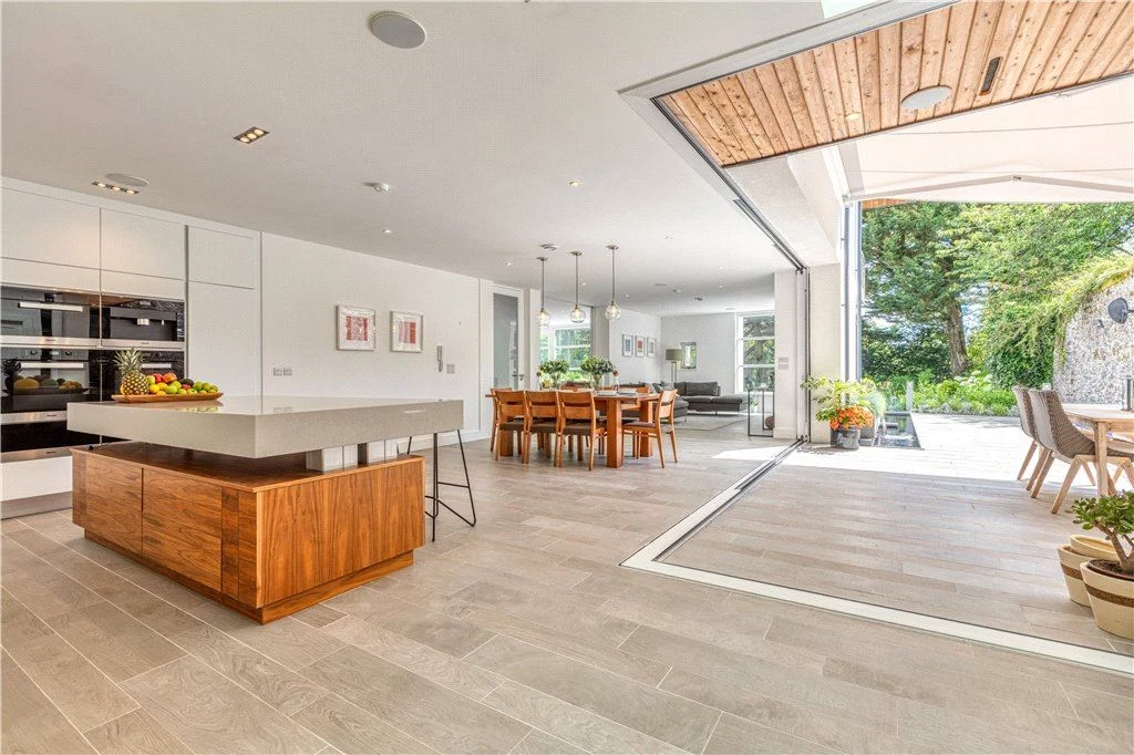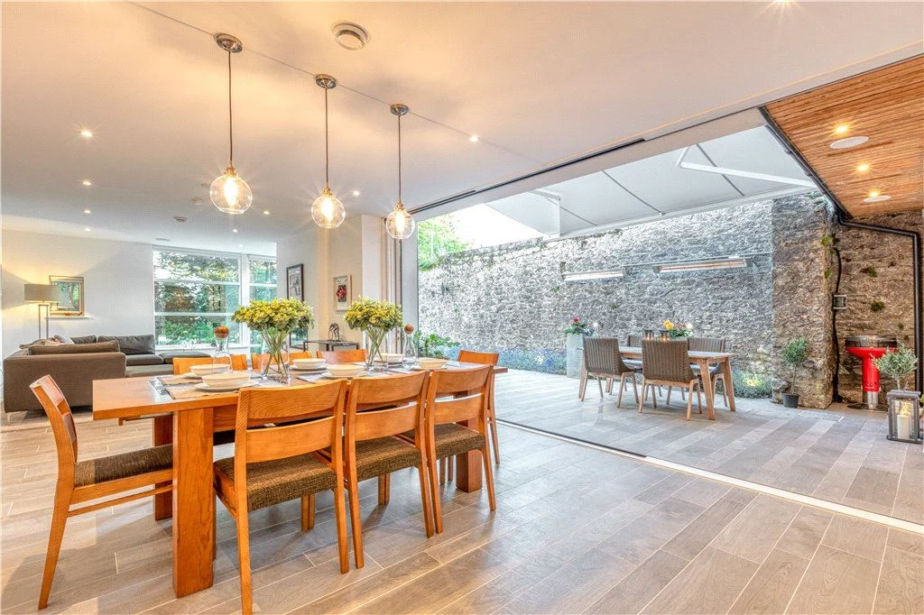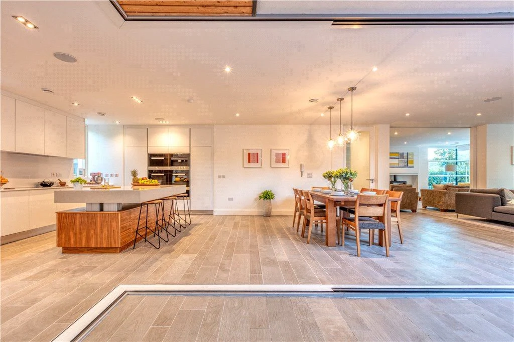 A bespoke walnut, white gloss and Silestone kitchen with Miele appliances and that rising and falling island sit next to a spacious dining area. The floor here runs to the exterior courtyard, where colossal triple-glazed glass doors slide from view, blurring the lines between indoor and outdoor. This is further enhanced by outdoor heaters and an electric canopy that can be rolled out over the sheltered courtyard.