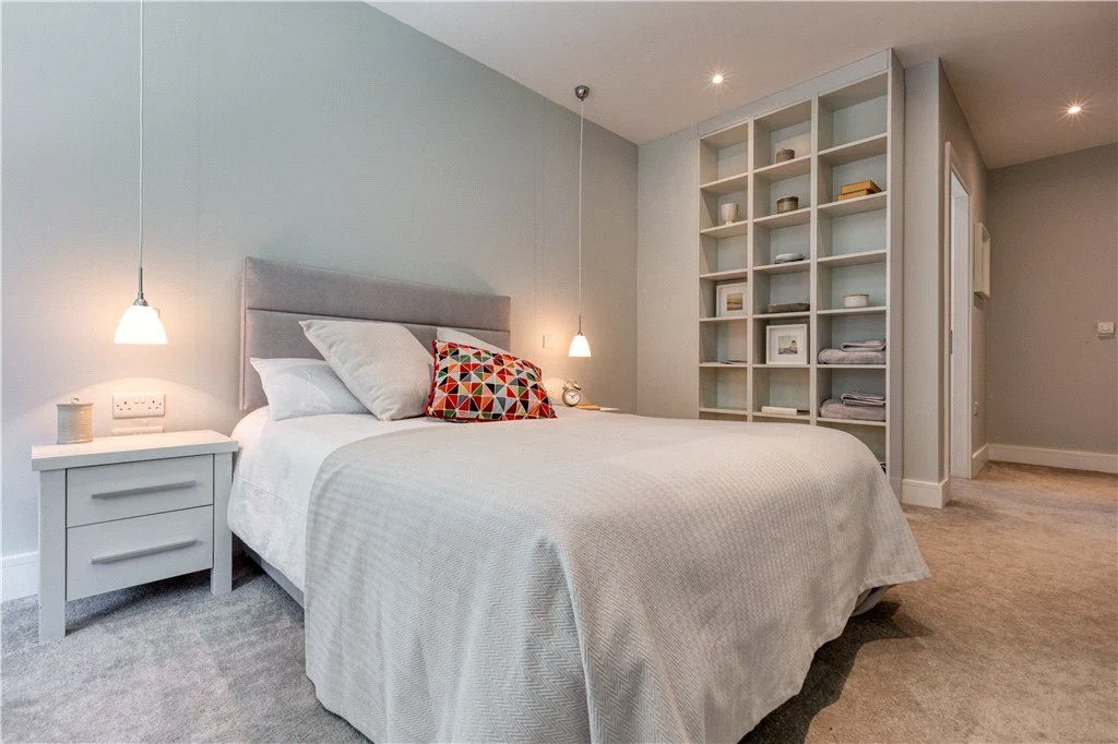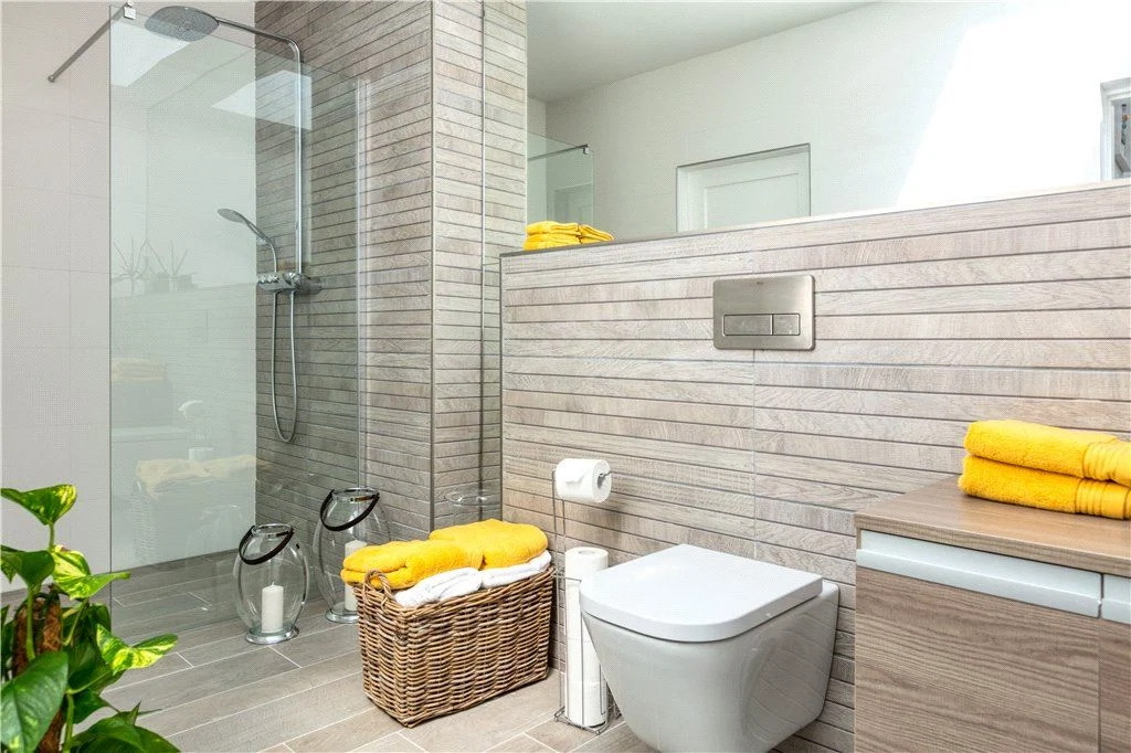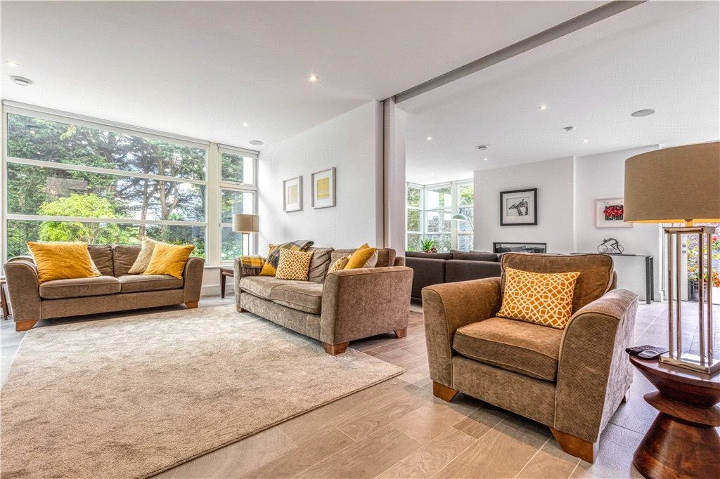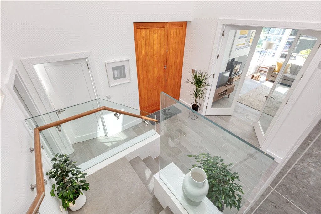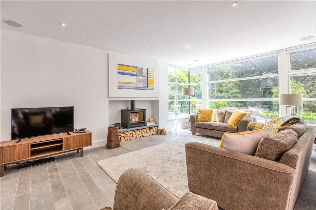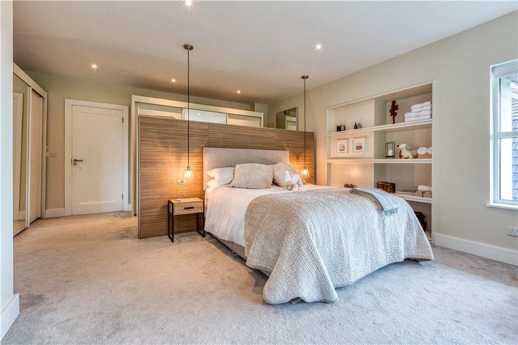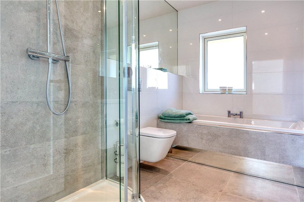 There’s also a utility room on the ground floor and a room that could work as a study, gym, or sixth bedroom, with a bathroom off that which is also accessible off the main hallway. Underfloor air-to-water heating, triple-glazing and passive-rating materials give this house an A2 rating.