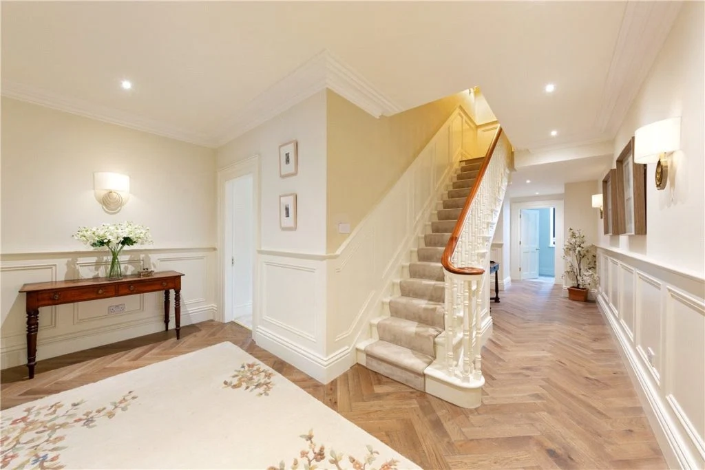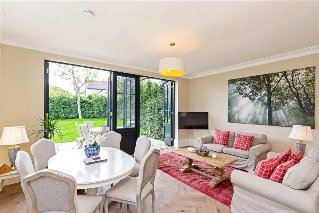 From the hall, interconnecting reception rooms are dual-aspect; overlooking the carefully-manicured side garden. The first reception room, which is the more formal of the two, comes with a feature marble fireplace.