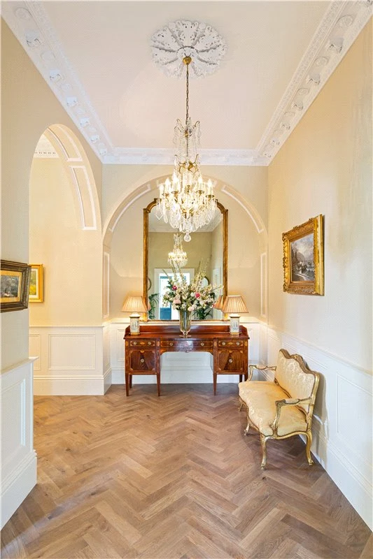 A gravelled driveway leads up to the glazed double front doors, which open into the entrance lobby and reception hall. Here, solid-oak parquet floors and high ceilings (with ornate ceiling coving and a centre rose) make the place feel warm and welcoming.