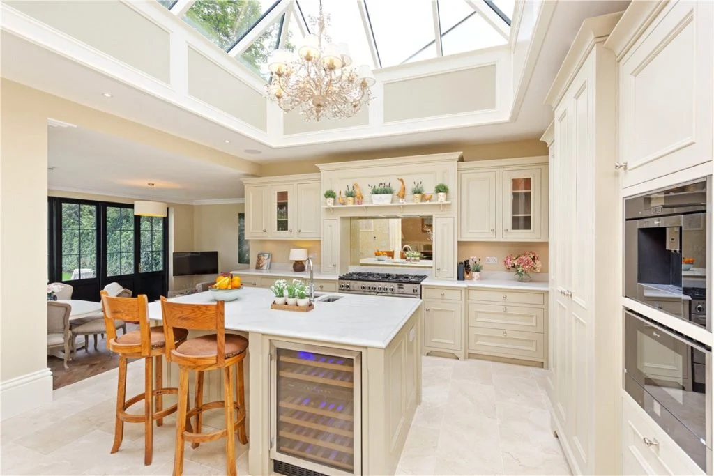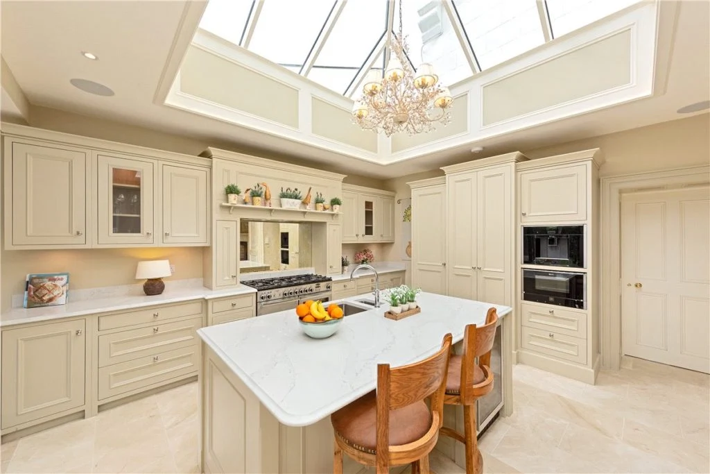 Other notable features here include Neff integrated appliances (such as a fridge, dishwasher, microwave and coffee maker) and a six-ring Rangemaster with double oven.