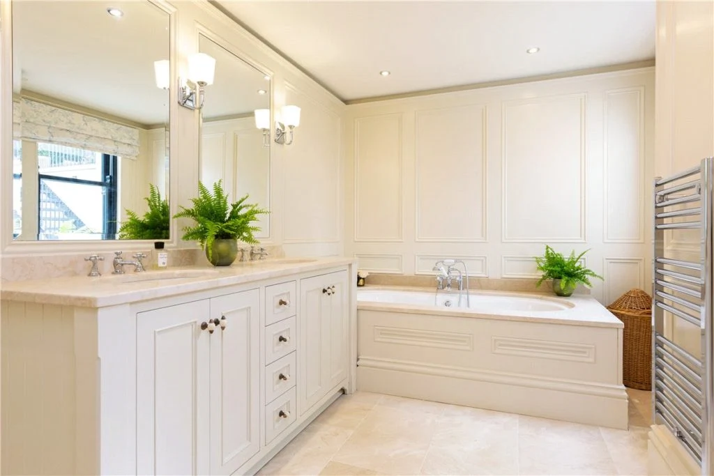 The master bedroom’s ensuite also has surround-sound, as well as a bath with Botticino marble surround. There’s also a shower area with rainwater shower head, a heated towel rail, and ‘his & hers’ sinks.