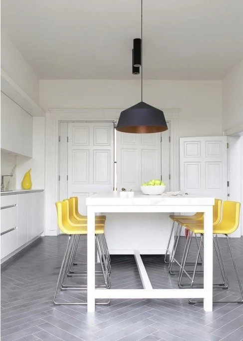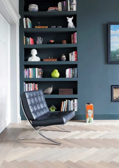 A Barceloneta chair sits on herringbone parquet from The Hardwood Flooring Company
