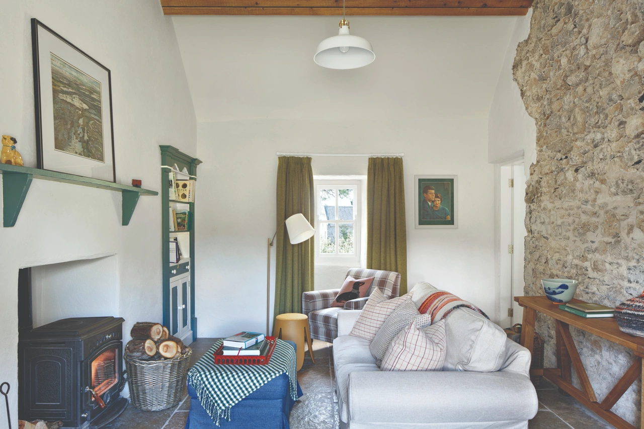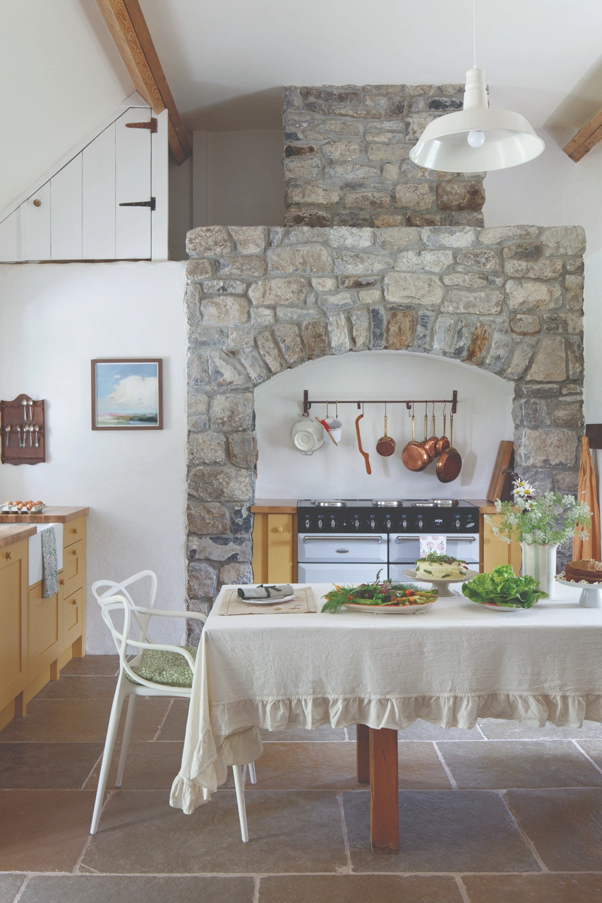 We are now in the fifth year of the project. With the cottage essentially complete, work has begun on the stone barn. After completing the historical research and securing planning permission for the thatch, we started the repairs, carefully preserving the fabric and integrity of the house. There was no real plumbing – just a spigot on the exterior wall – and no heating system, aside from an old Stanley wood-burning cooker in the kitchen and a fireplace in the parlour. There was also no toilet, so these had to be thoughtfully added. The thatch itself needed a complete overhaul, a process that took two years. Through it all, I’ve learned that patience is essential when restoring a historical structure.
