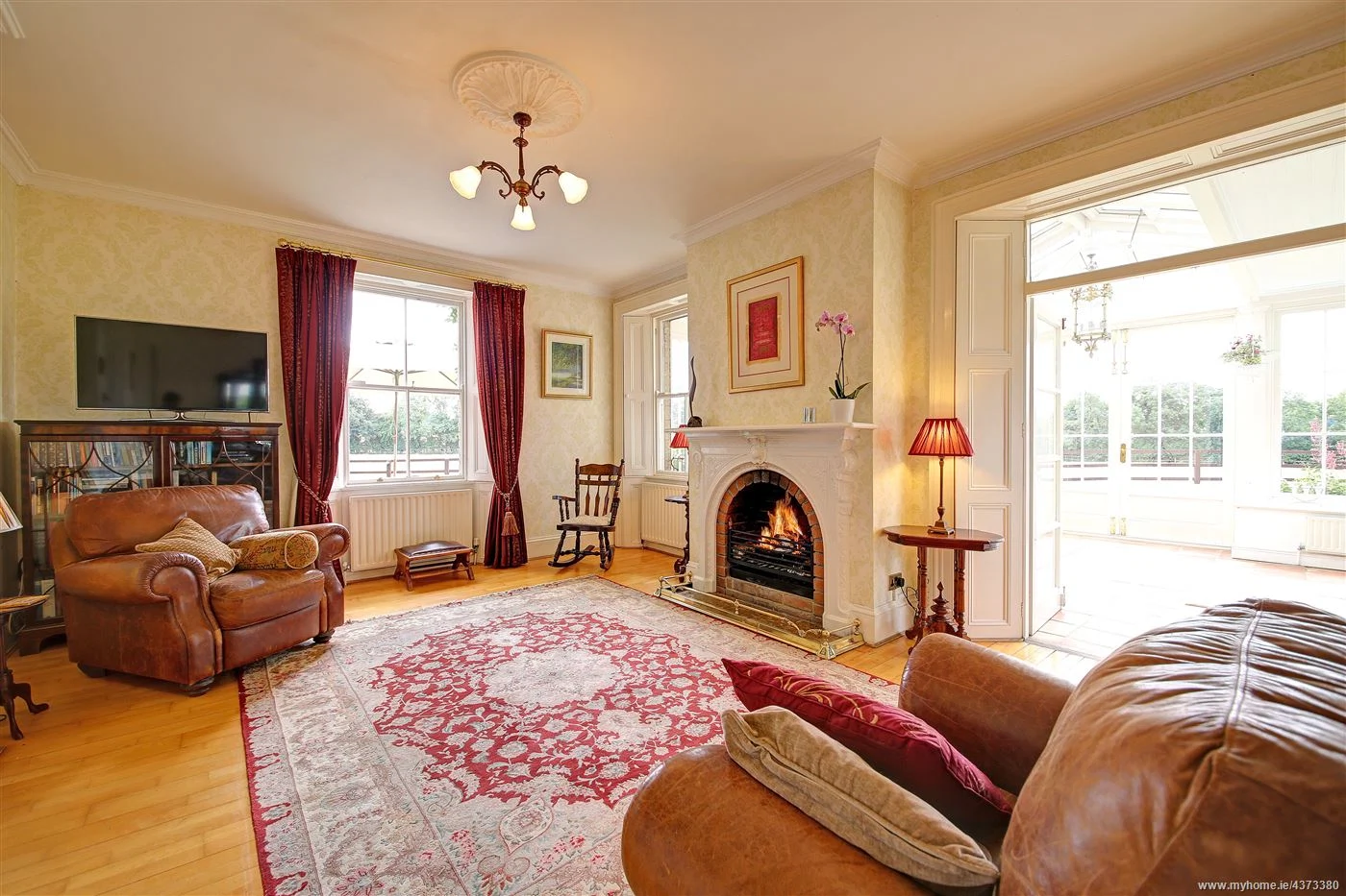 On the market for €1.35 million, there are two well-proportioned sitting rooms off to the left of the front hall. Through the second is a large and bright garden room with French doors opening onto the manicured lawn.