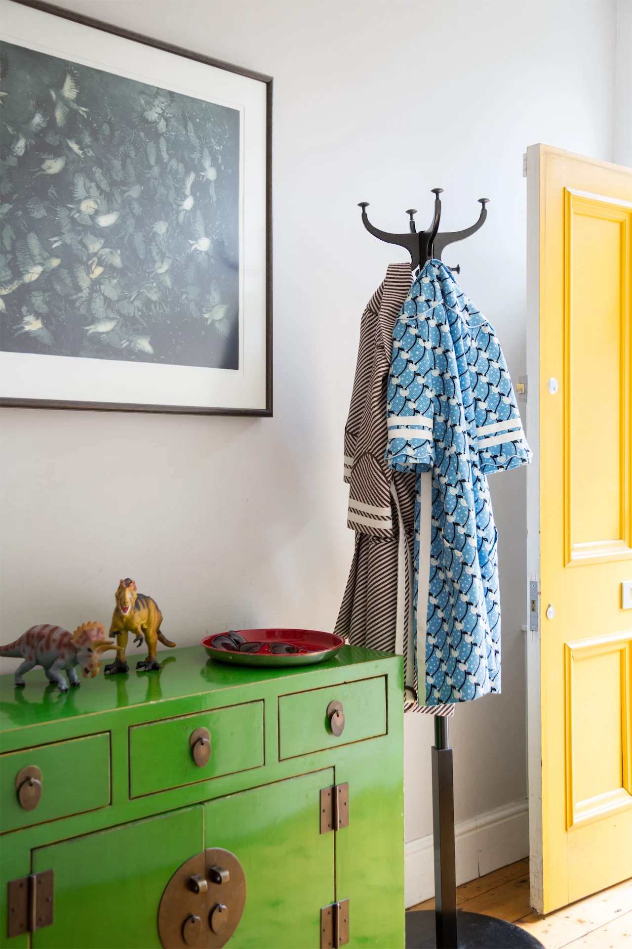 On opening the hall door you see straight down through the kitchen to the garden beyond. The front living room, into the left, interconnects with the playroom and then the kitchen, keeping the whole floor open and sociable, and each space is lifted with bold, bright pops of primary colour – from the M&M green Asian sideboard in the hall to the London Bus red cabinets in the playroom and the glorious bursts of yellow in the kitchen.