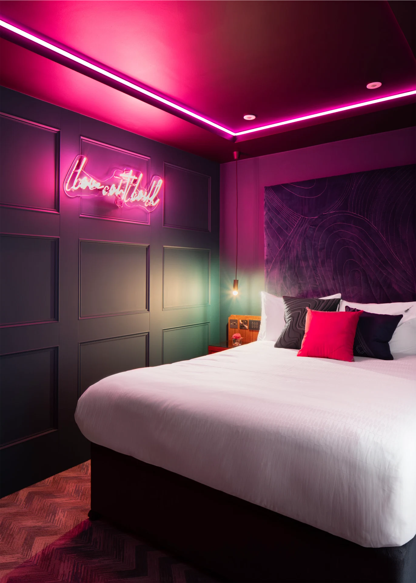 - I can’t start this off without talking about the ‘Love Out Loud’ sign. It’s a bold statement piece that embodies the room’s theme of celebrating love and pride. It adds a vibrant and modern touch to the space. It was custom-designed for this room and created by a company here in Dublin called Club Neon – Sean, the owner, is known for his unique and high-quality neon work. The sign serves as both an art piece and a source of ambient lighting, creating a dynamic and welcoming atmosphere. It’s a visual representation of the room’s ethos, encouraging guests to express themselves freely.
