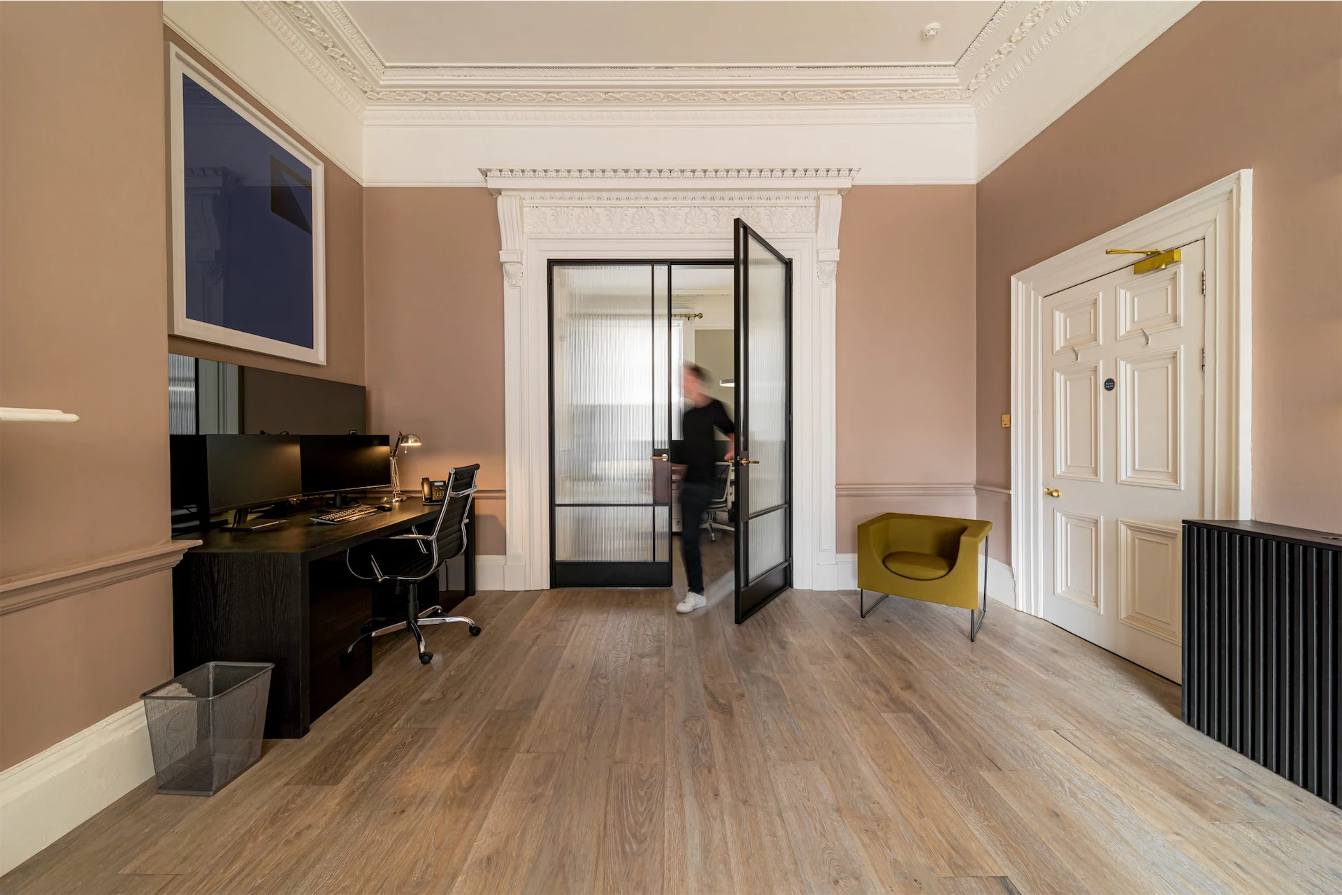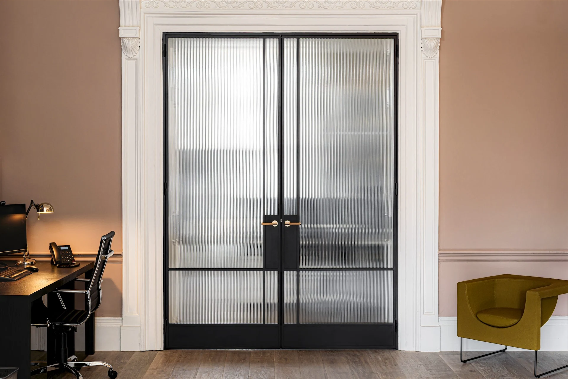 The result? “Simple, refined steel doors with reeded glass allowing diffused light to flow between each office space yet at the same time allowing privacy. Working with this Georgian style and seeing both projects completed was something special.”