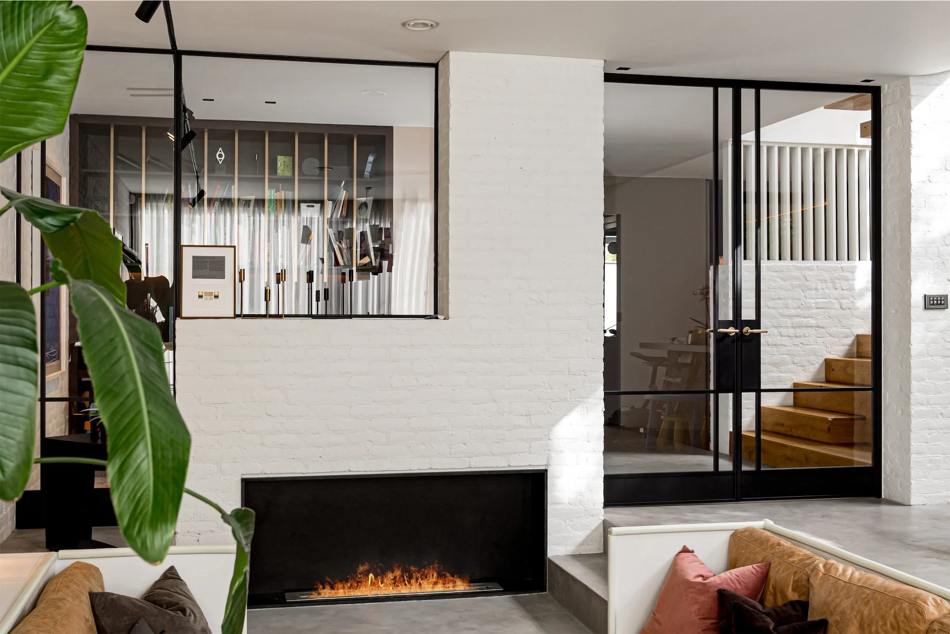 “Declan wanted to break up a large living area, creating zones but still allowing for flow. The clear glass and slim frame allow for this flow, creating a partition between two rooms without impacting light or the feeling of space.