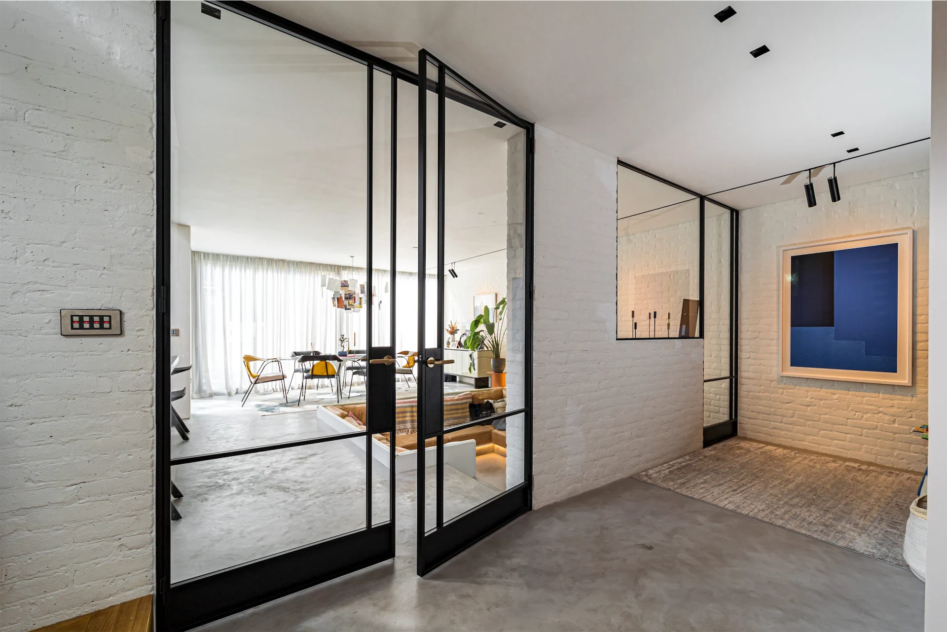 “The client had floor-to-ceiling in his design, taking it to the top, with slim frame steel double doors on one side and steel frame glass partition on the other. Floor-to-ceiling gives it a seamless transition, in keeping with the colour palette and perfect mix of materials, off-white walls and a polished concrete floor.”